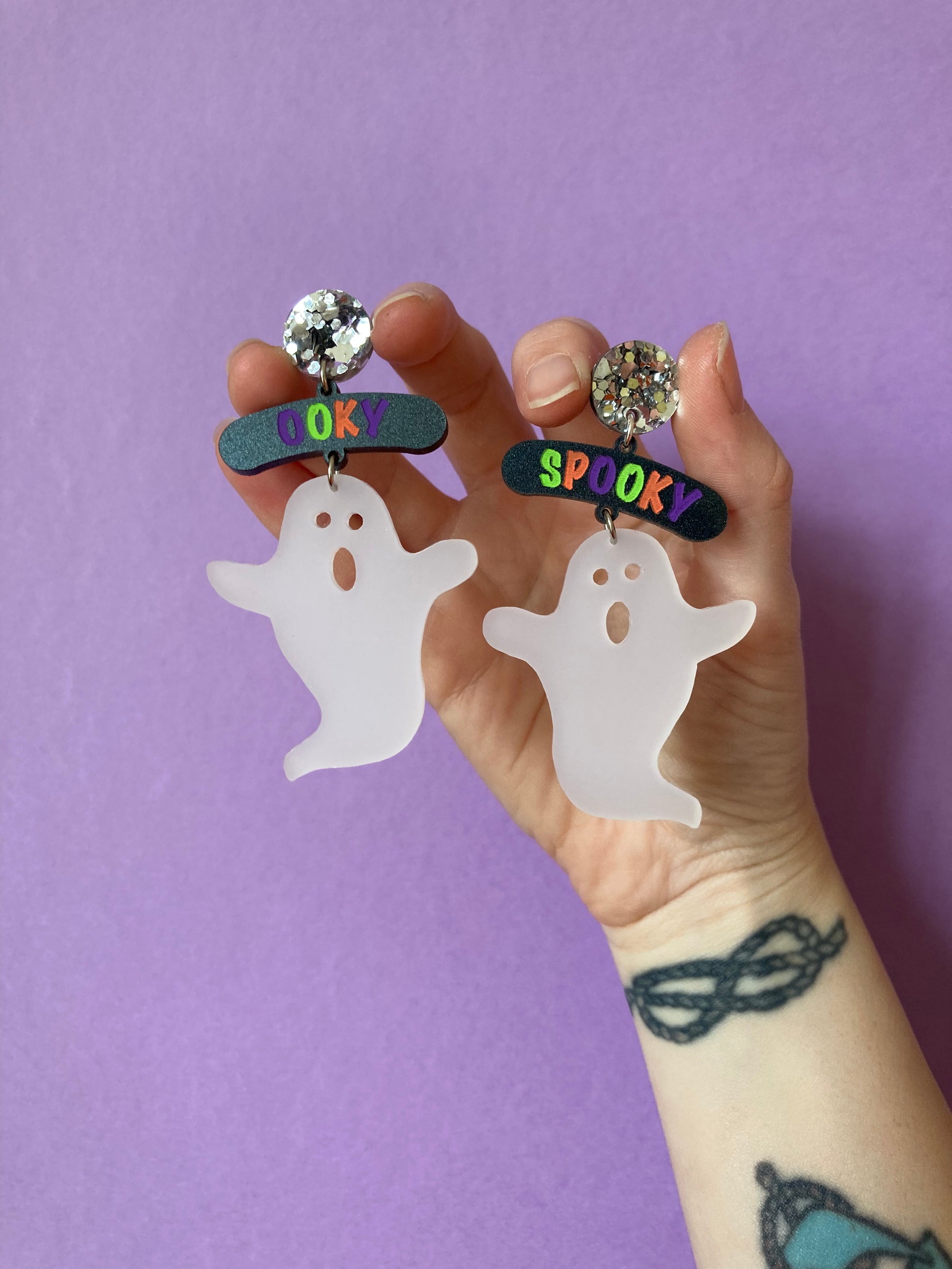 Frosted white ghosts suspended from chunky silver glitter discs with black curved acrylic bars engraved with the words 'ooky spooky'