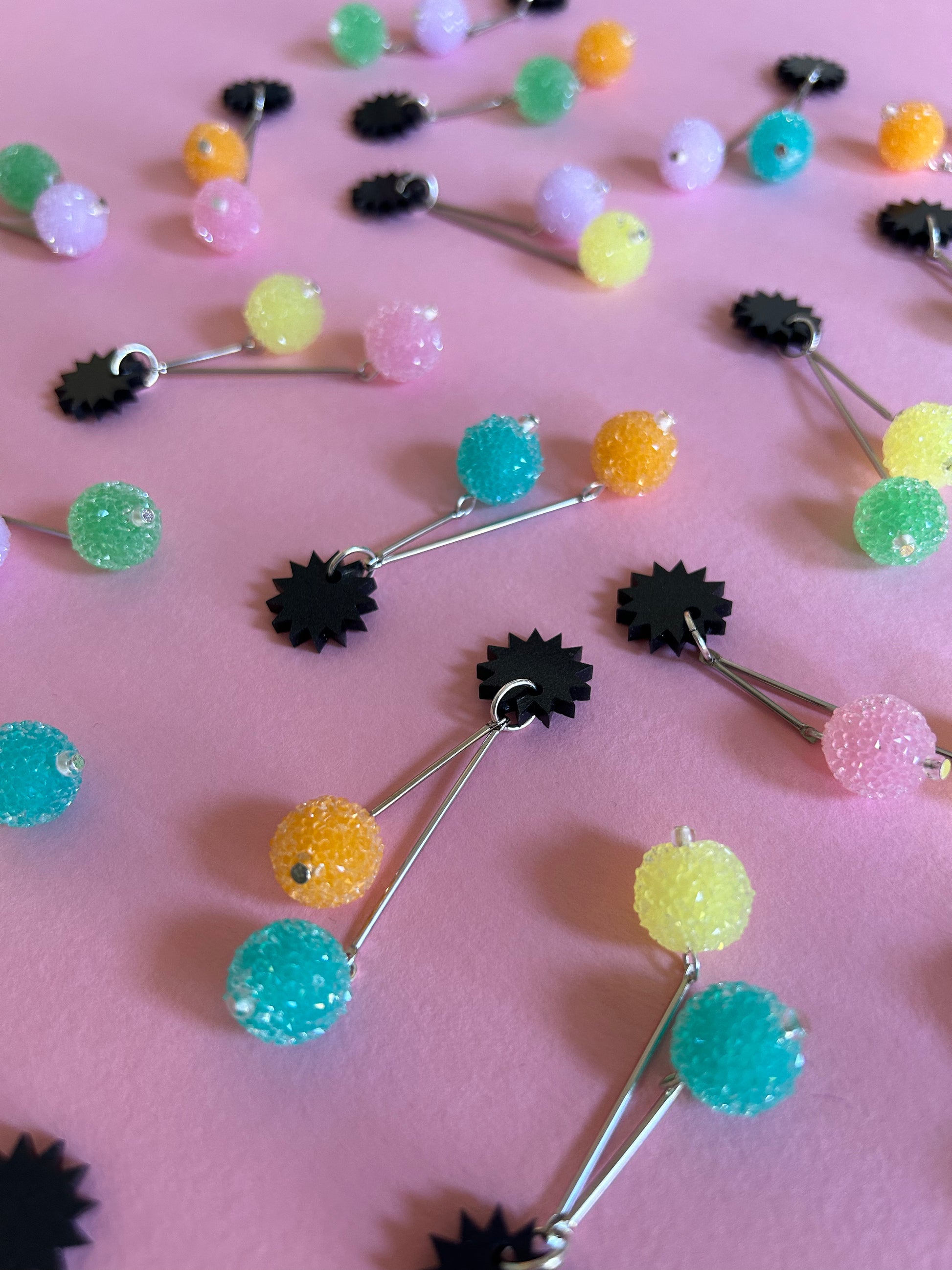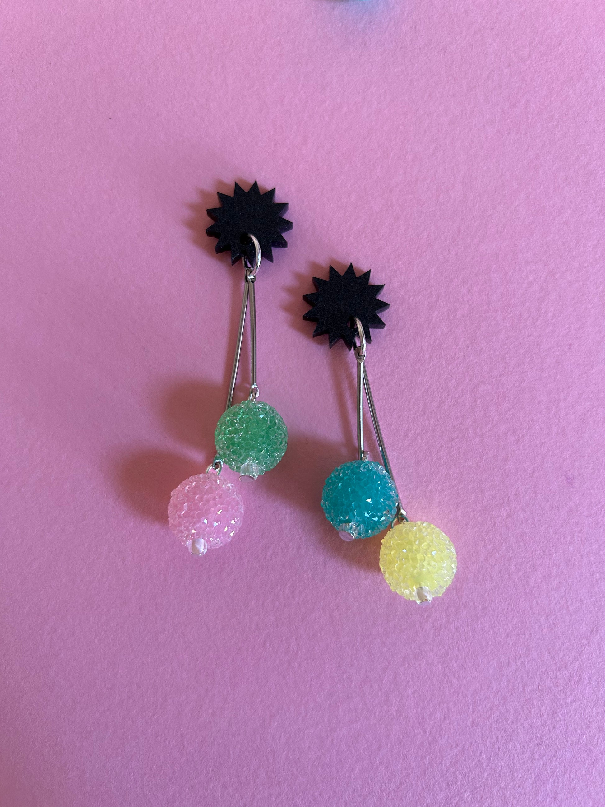Shimmery black acrylic starbursts with pastel crystal beads suspended on metal bar findings. Each pair is random with each bead being a different colour :)
