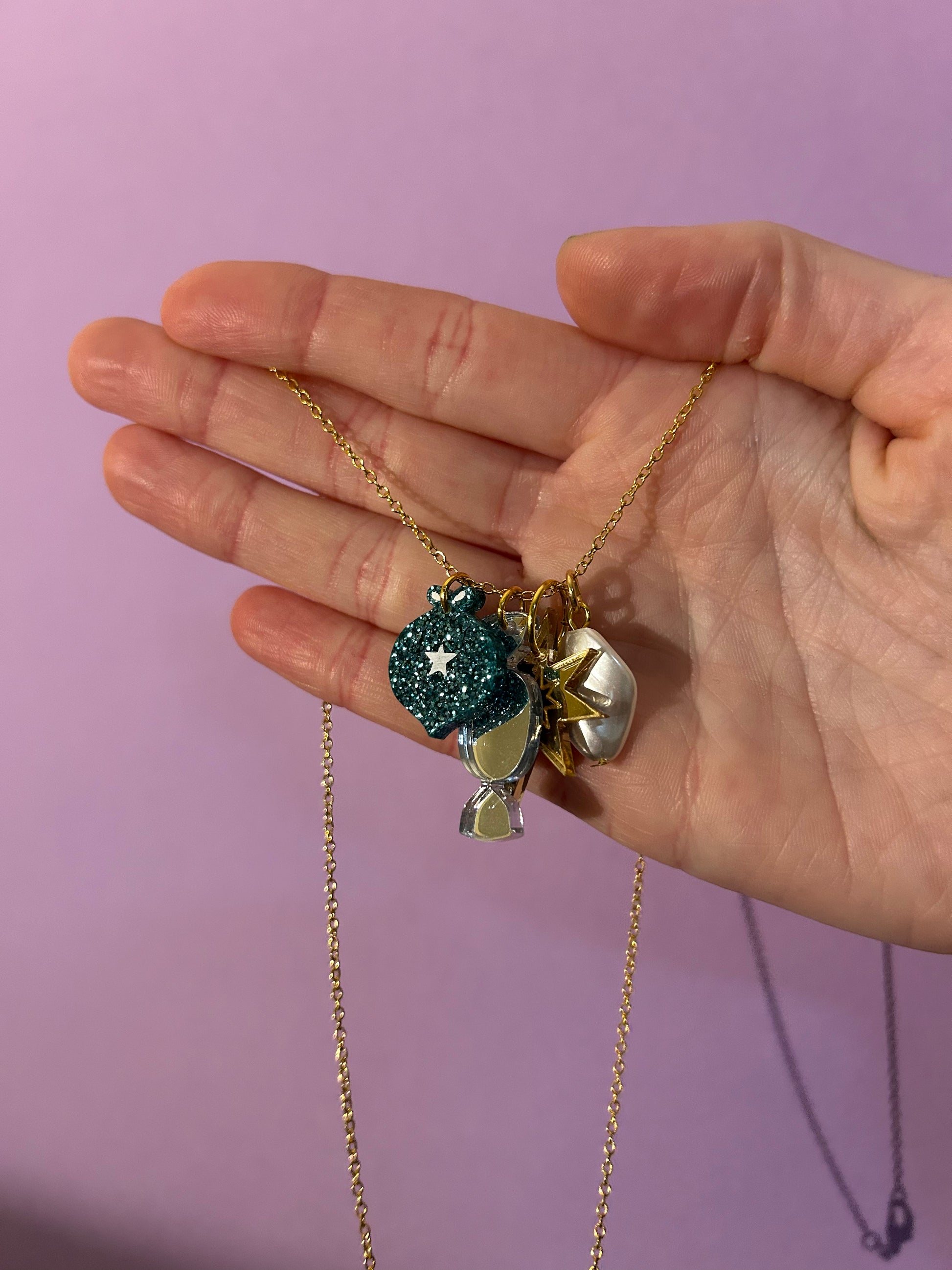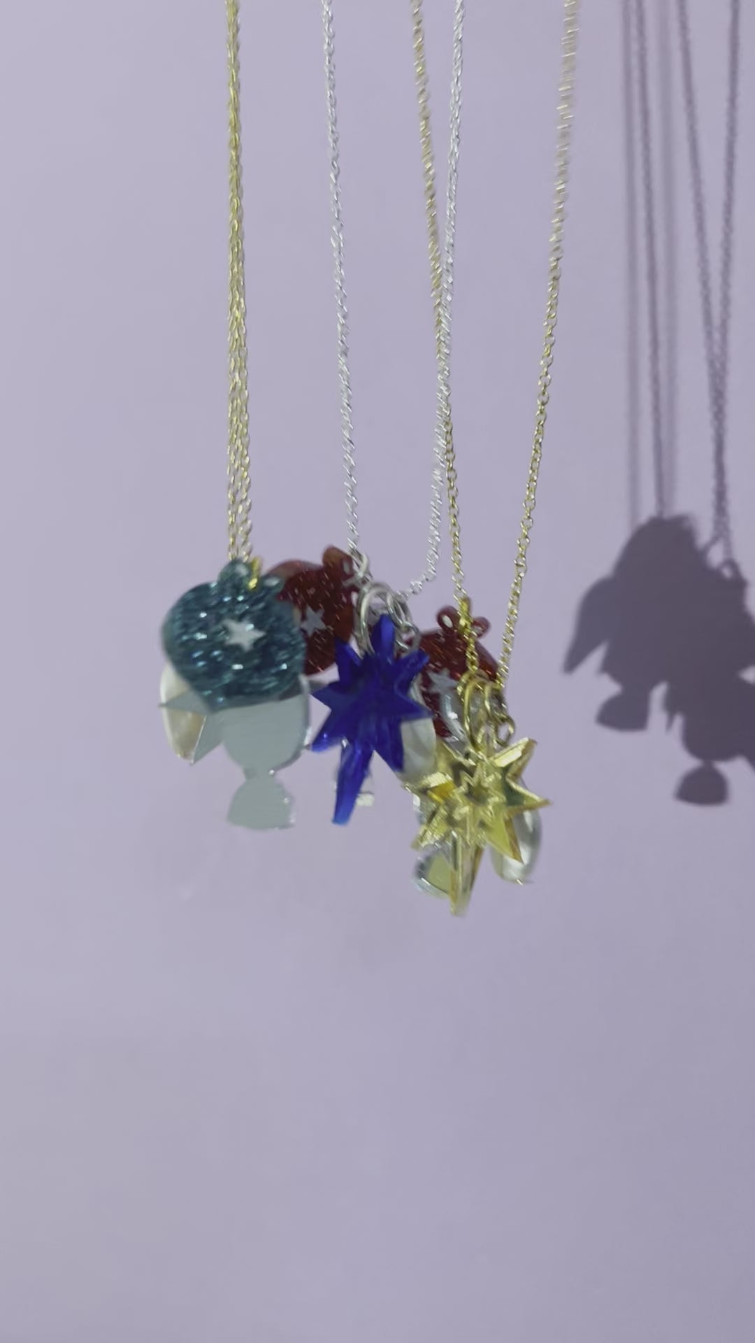 Each necklace features a glittery acrylic bauble charm, a mirror sweetie charm, a mirror star charm and a twisted pearly bead. The options are:
