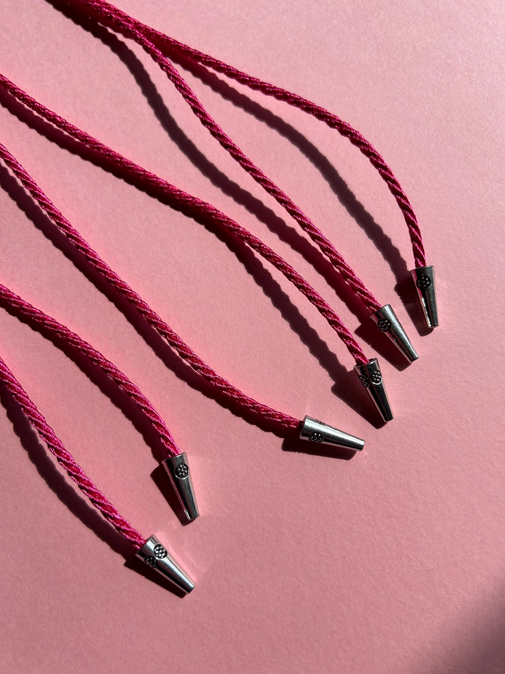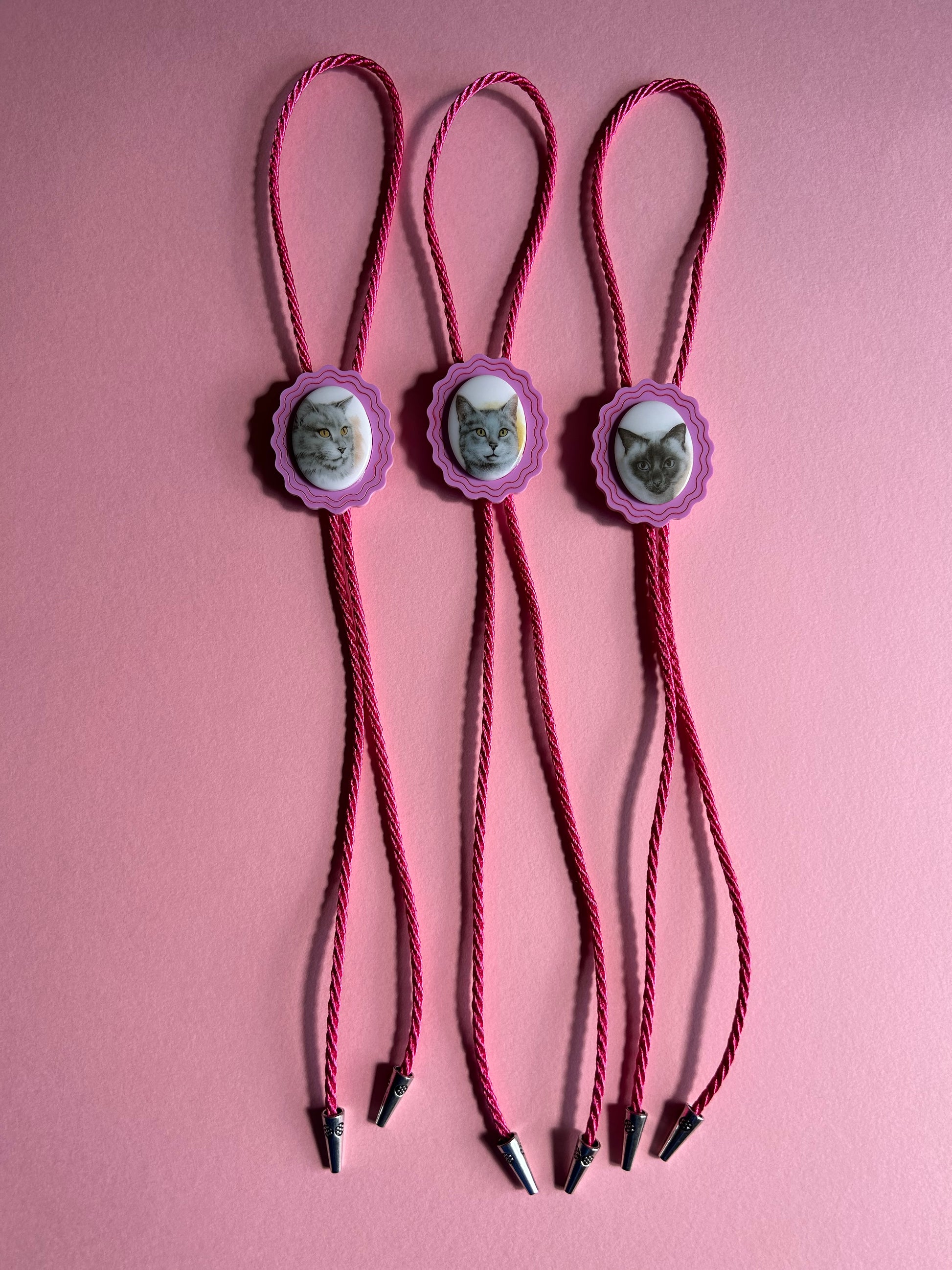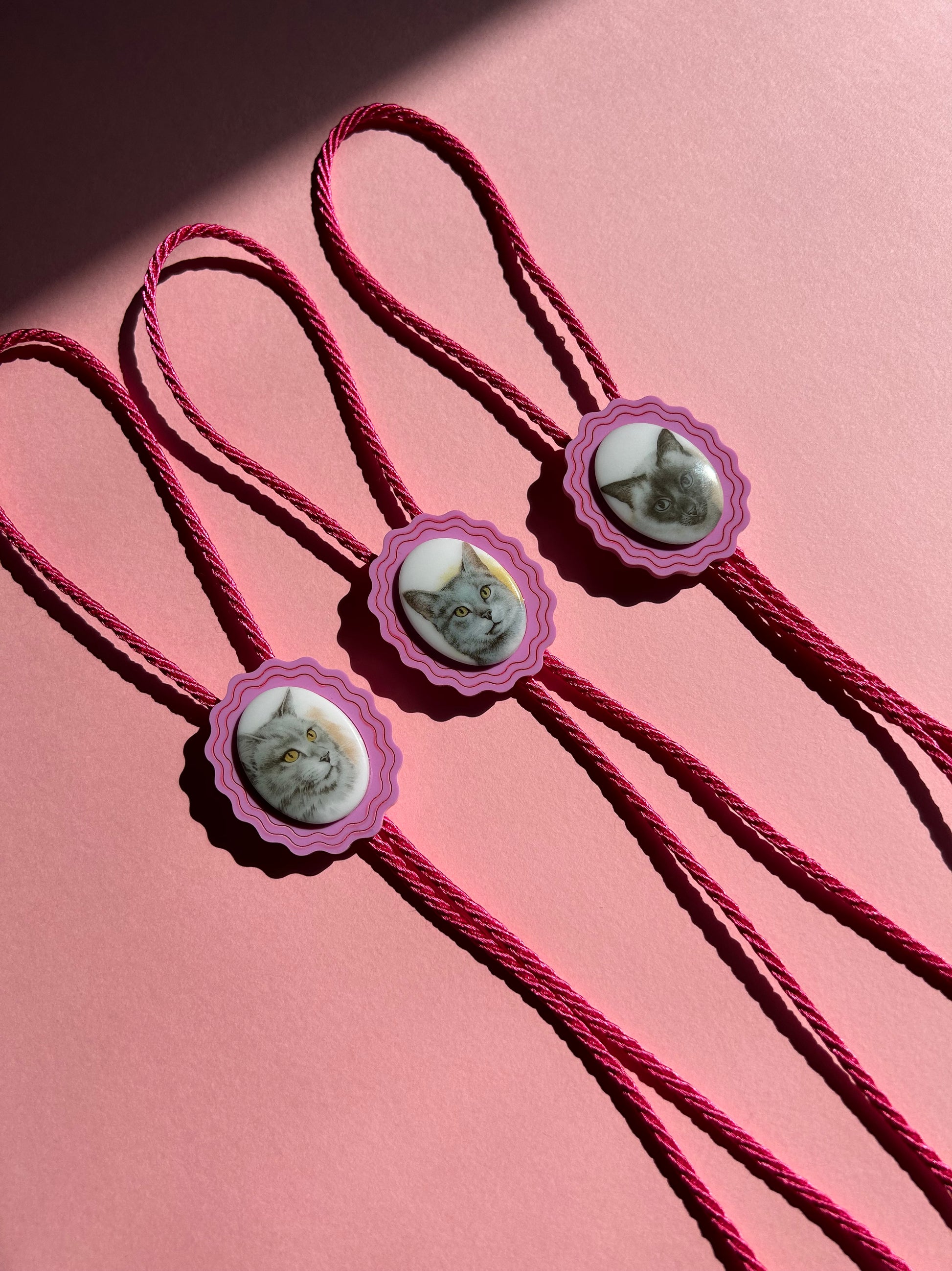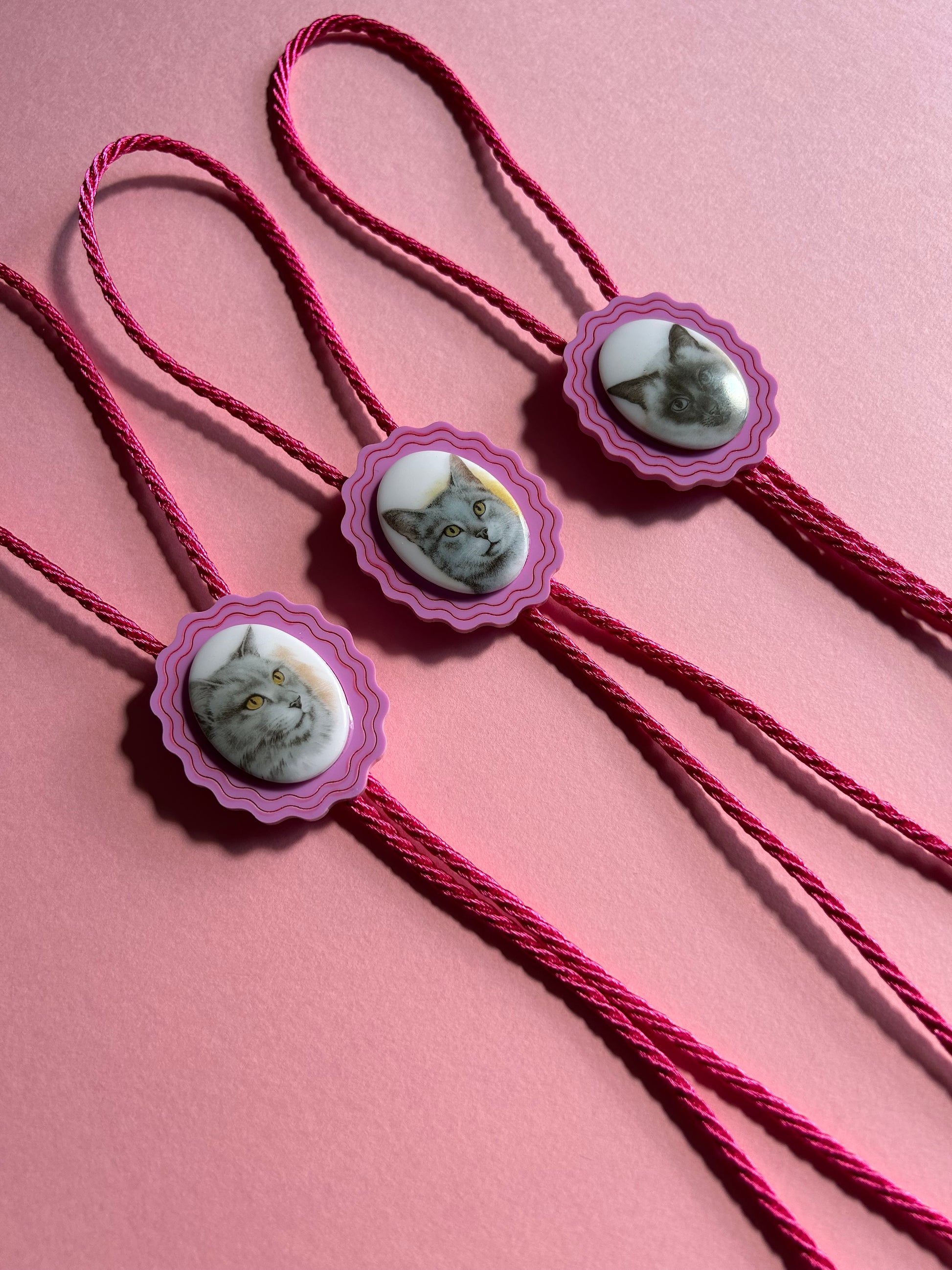 OH MY GOODNESS! These have been sitting in my 'to do' pile for a very long time but I finally found some rope for these beauties! Each of these ties feature a vintage cat cabochon on pastel raspberry acrylic, cut and engraved by me! The tie ends are silver metal bead caps with flower stamps on them and the rope is magenta. These are pretty fabulous if I must say so! They are labelled as so: