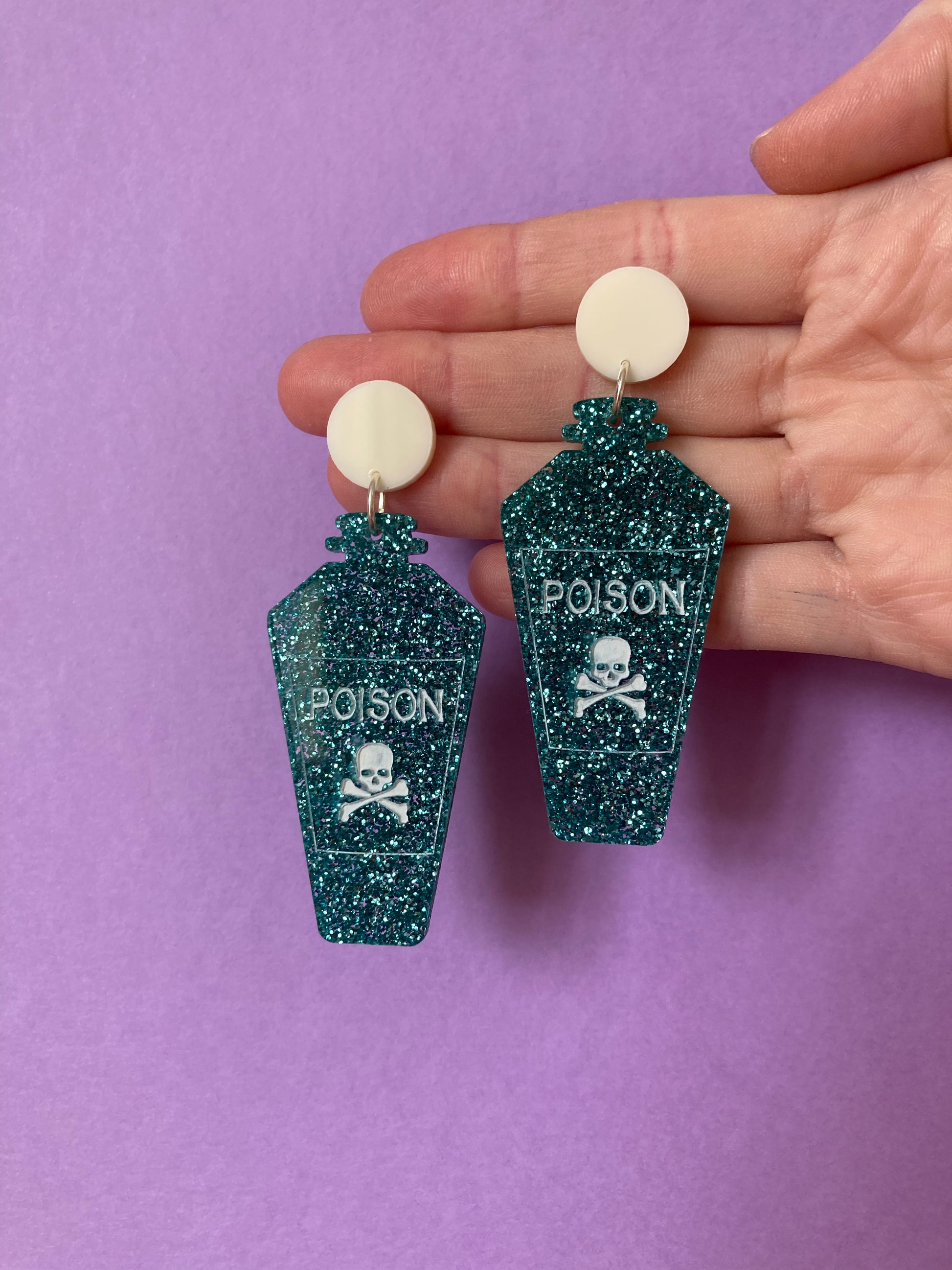 Green glitter poison bottles with engraved and filled white writing and skull & crossbones suspended from acrylic discs in a creamsicle shade.