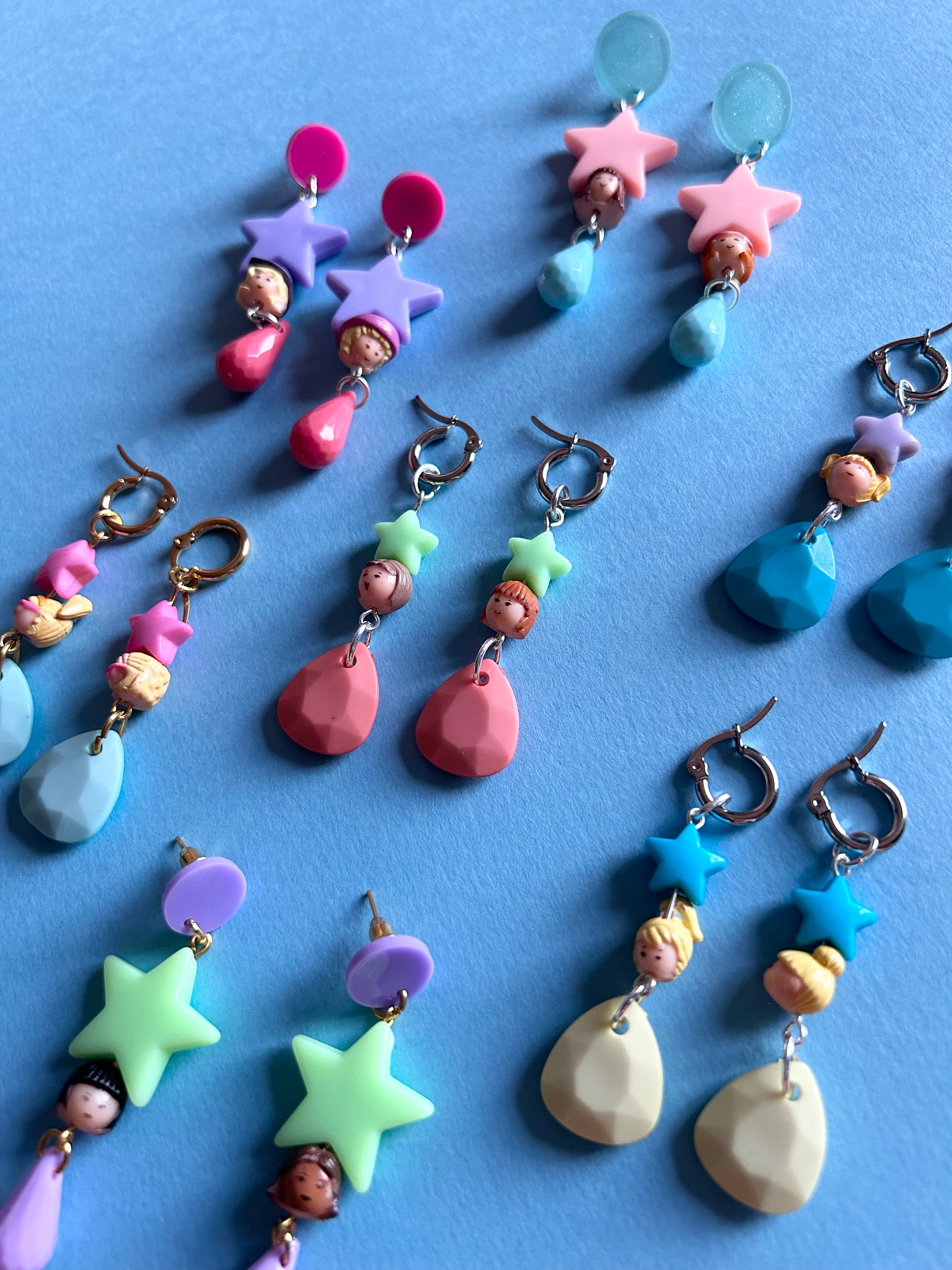 3. Silver hoops, mini lilac and pink star beads, ponytail Polly Pocket heads, big blue faceted beads