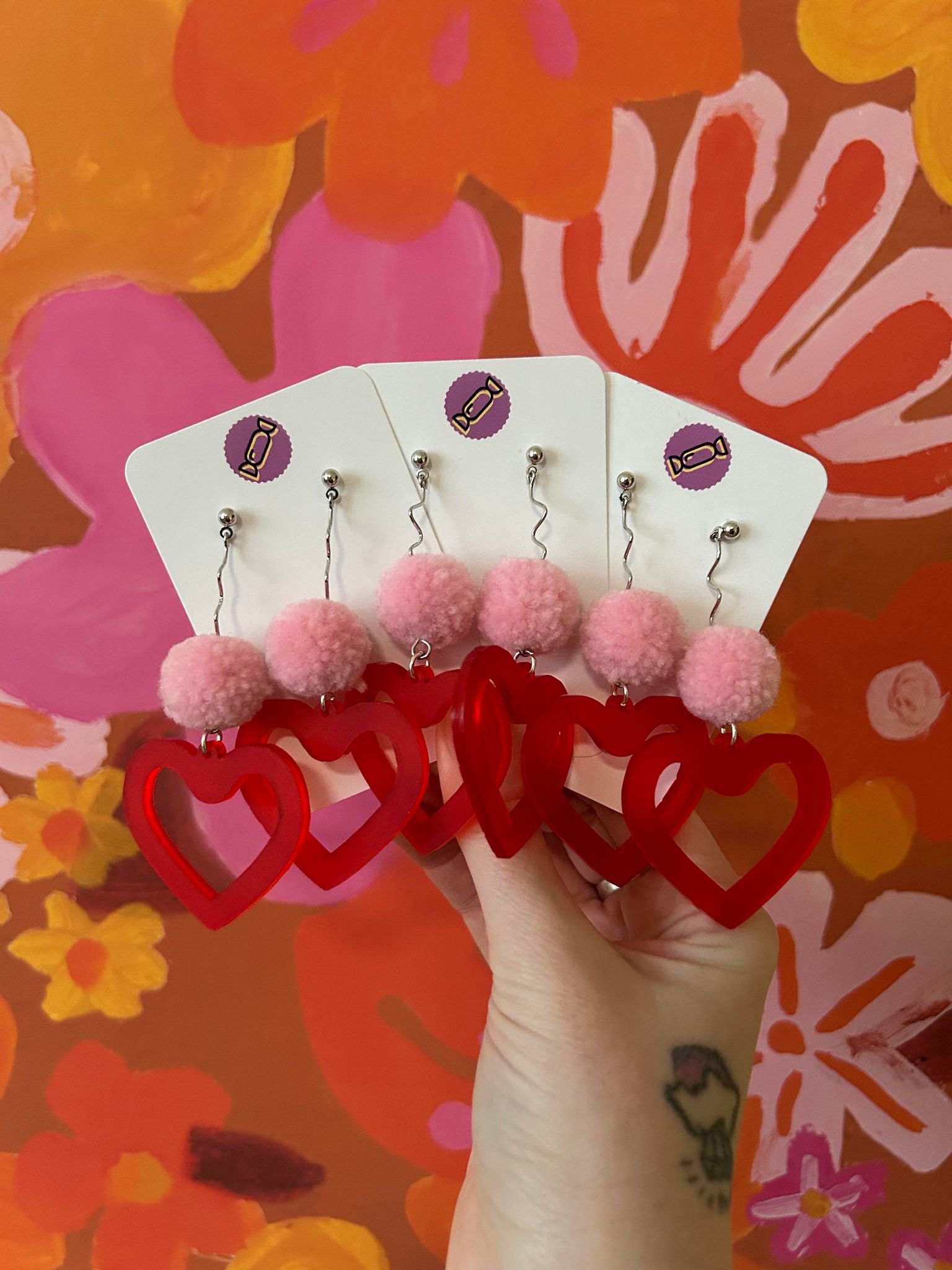 Squiggly silver wire drops, baby pink wool pom-poms and frosted red acrylic heart drops! These are larger than large but still super lightweight :) Perfect for every day including Valentines!