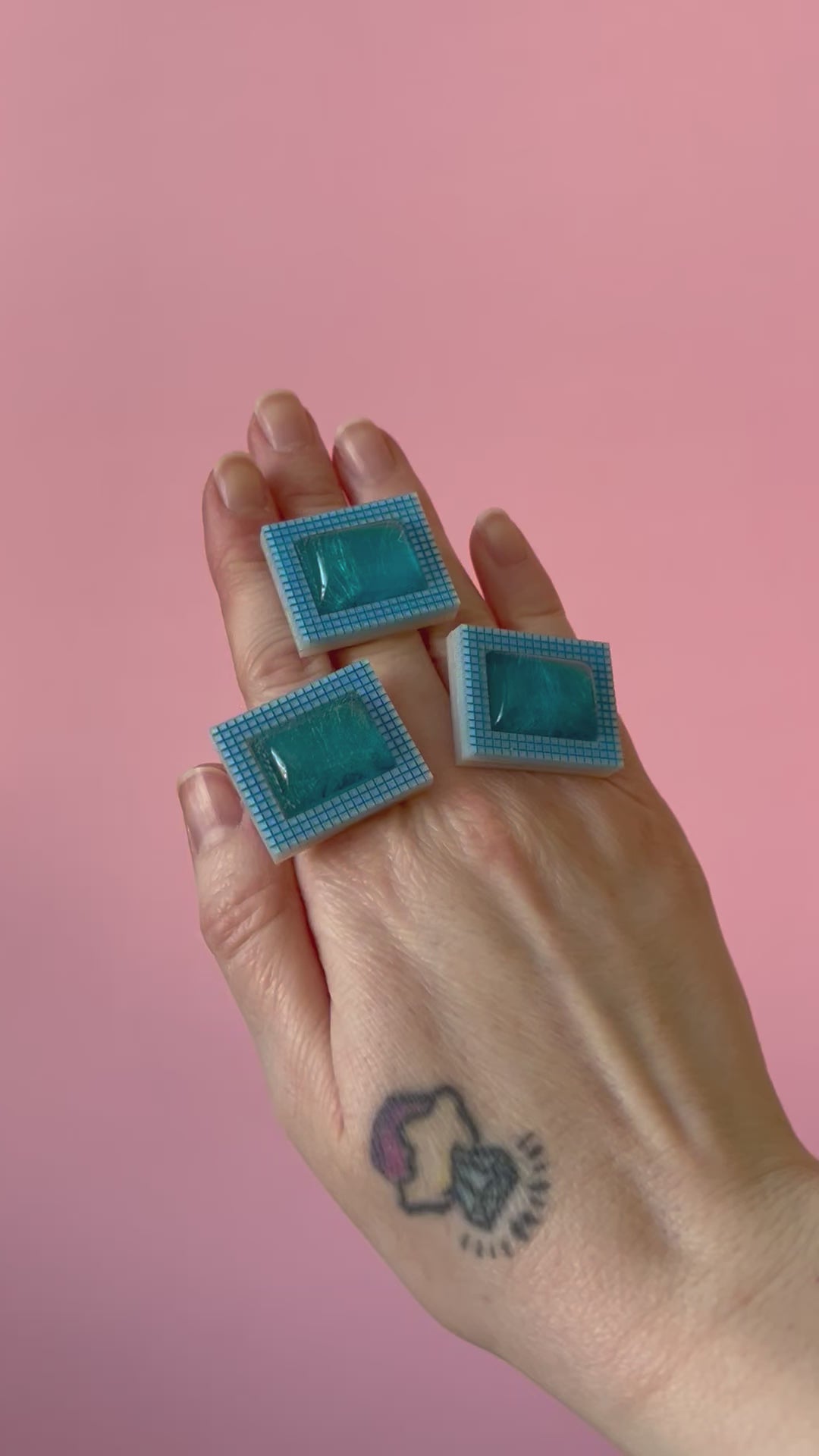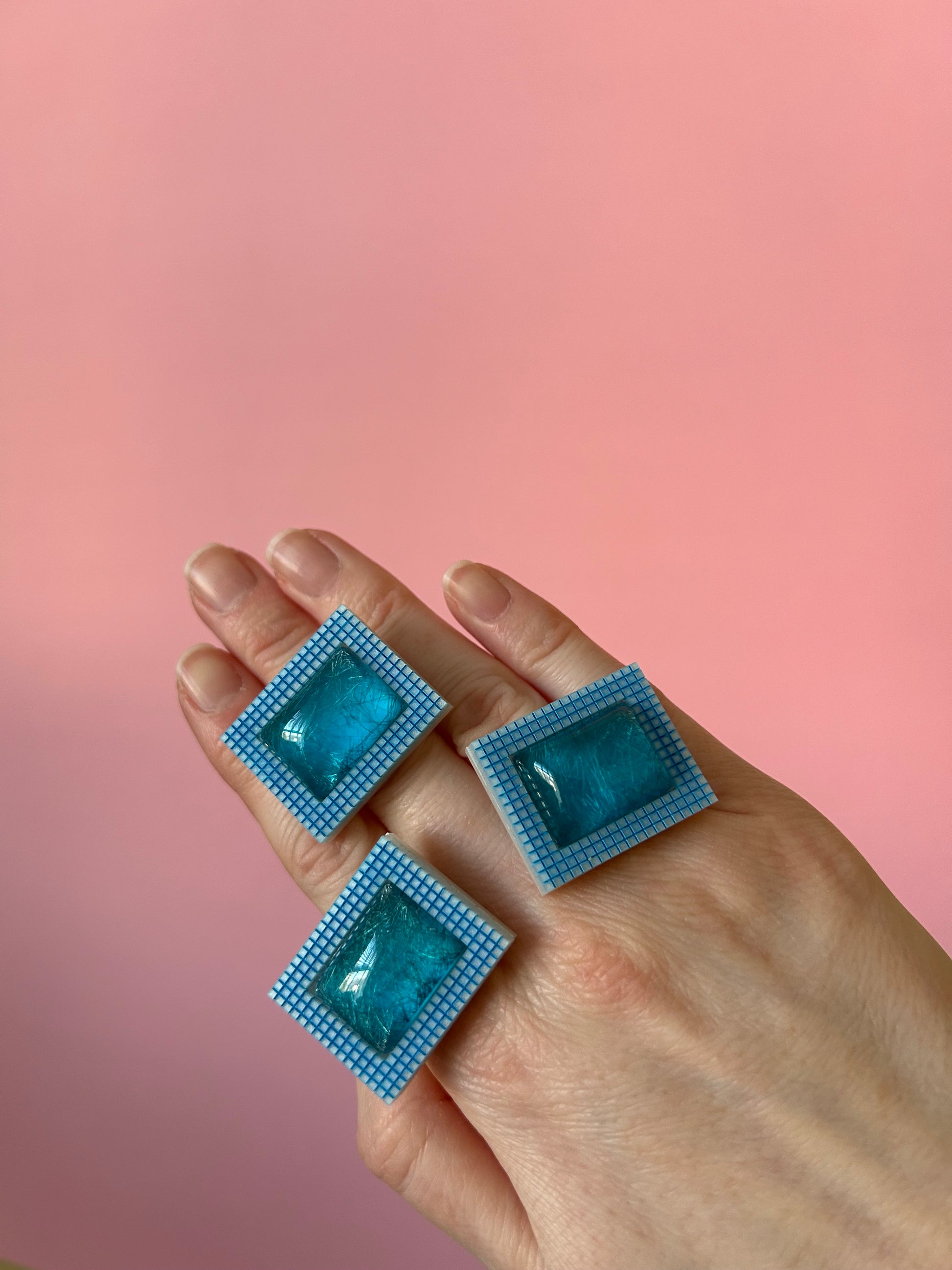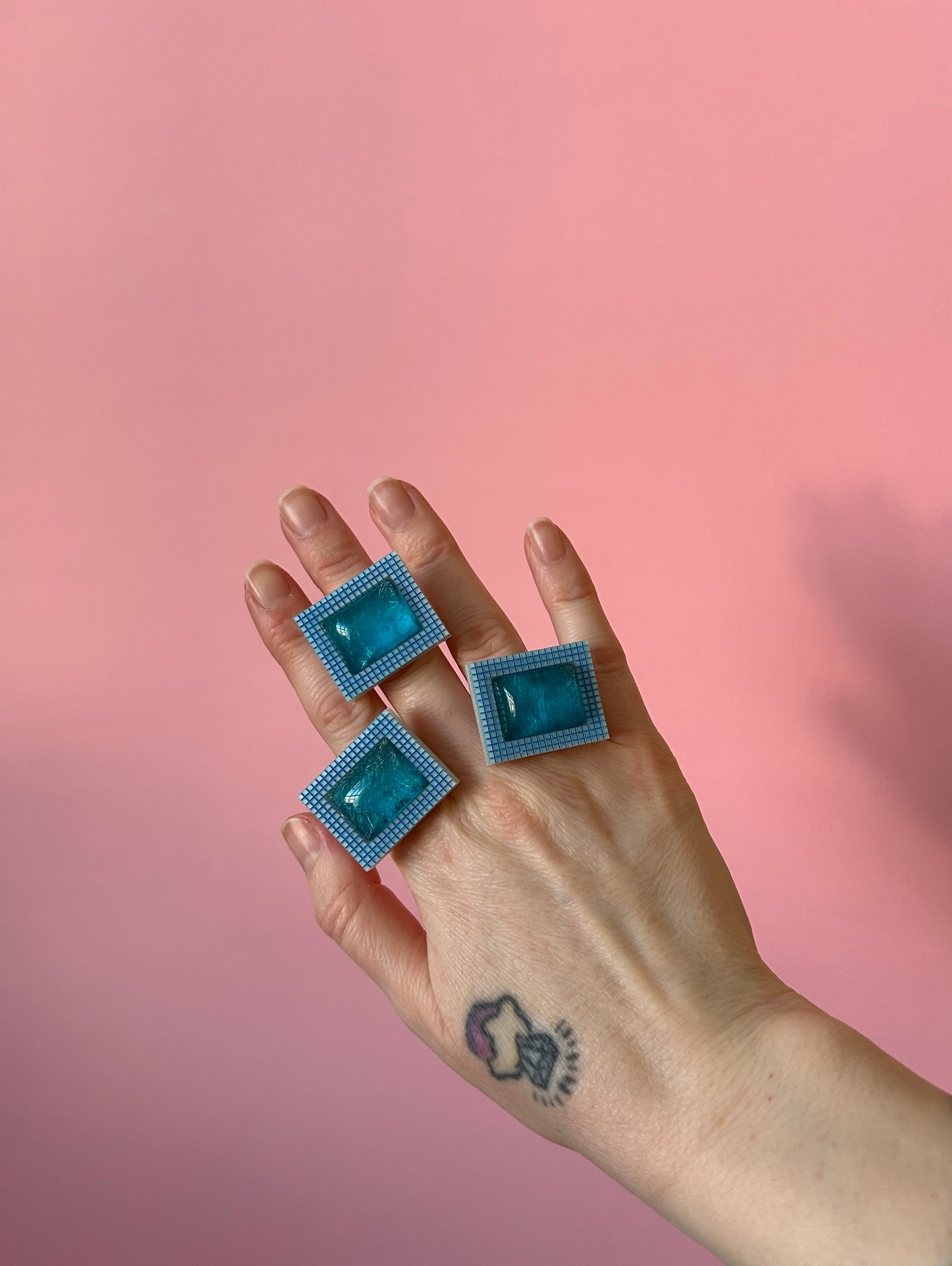 I got these gorgeous shimmery blue dome cabochons and they reminded me of swimming pools, I engraved and cut two layers of acrylic to make this a bold statement ring! Each one is on a silver plated adjustable ring base.