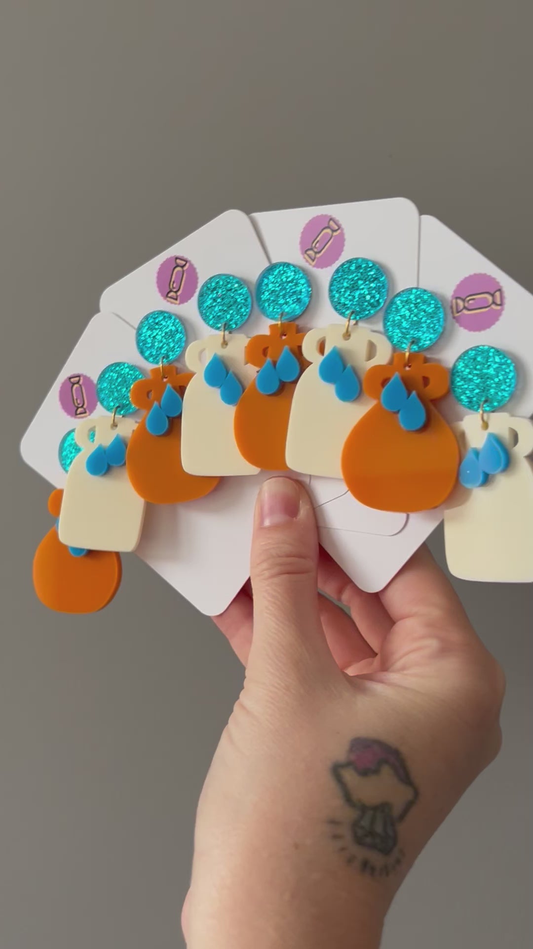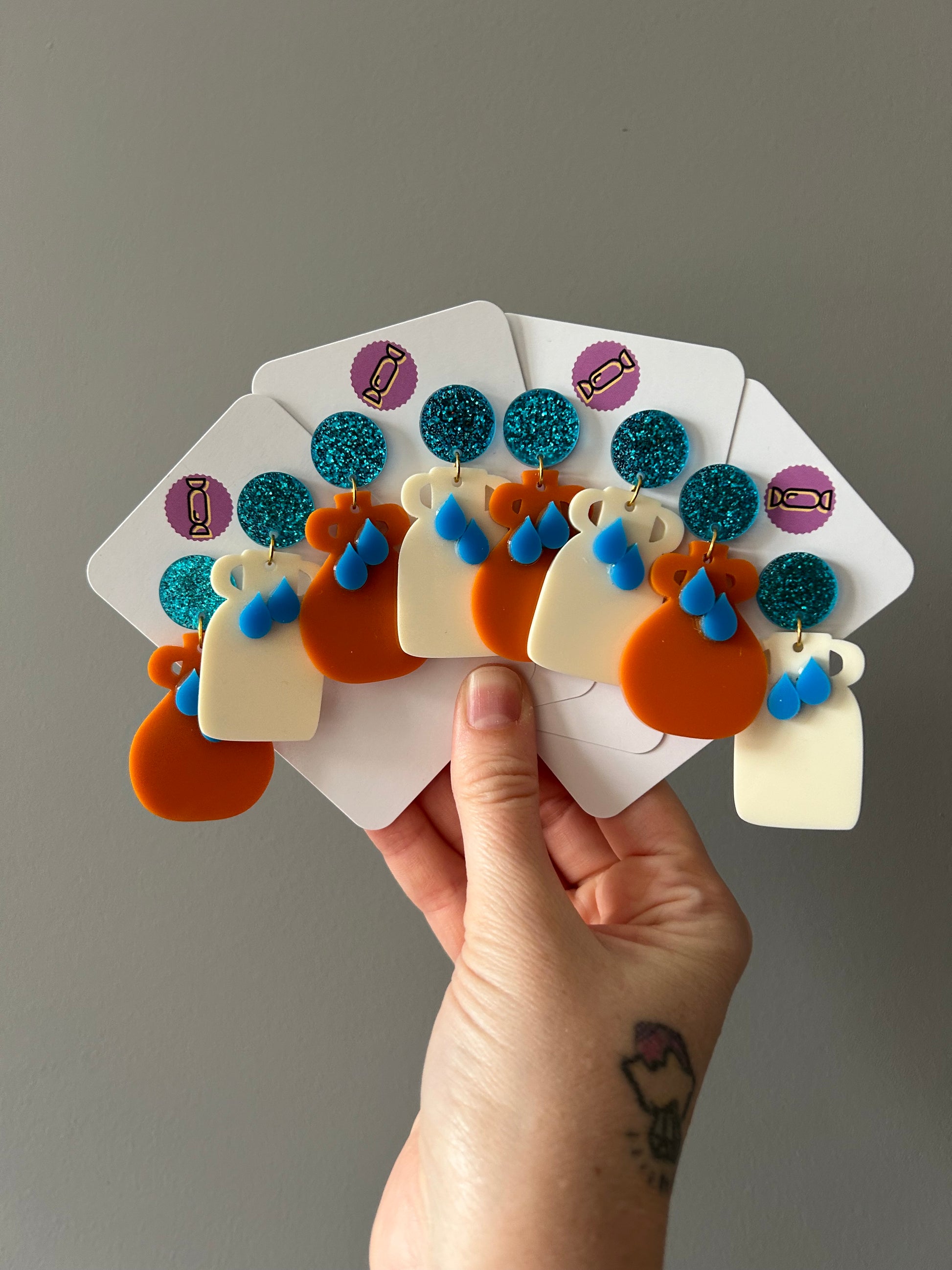 These are an old design reimagined with blue acrylic water droplets and glittery blue acrylic discs. Each pair is slightly different due to the pot combo and placement of water droplets. Your pair will be picked at random.