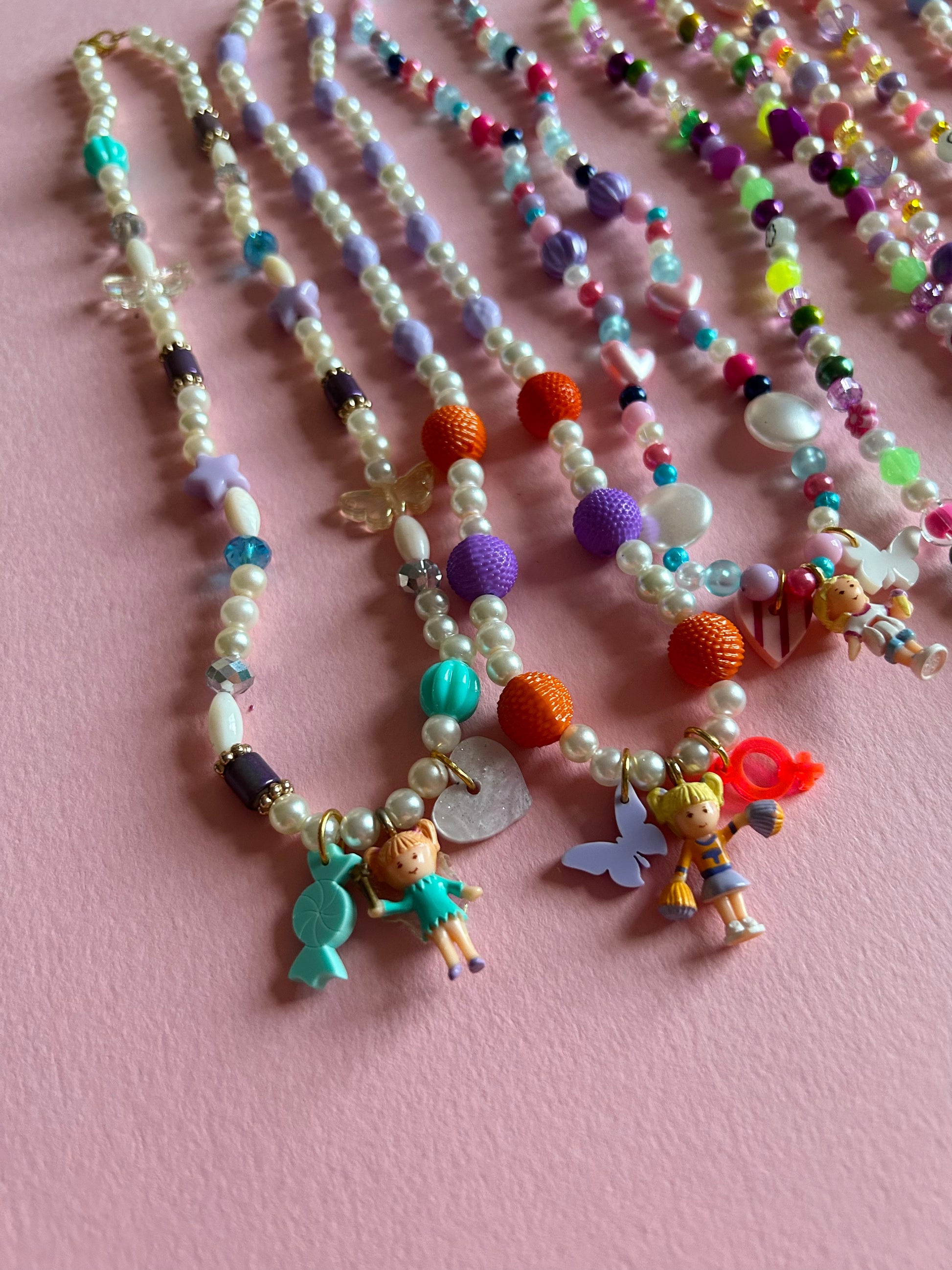 I rescued and revived these classic Polly Pocket charms and strung them on nylon cord with a gorgeous mix of old and new beads with pearly accents and acrylic charms in the following options: