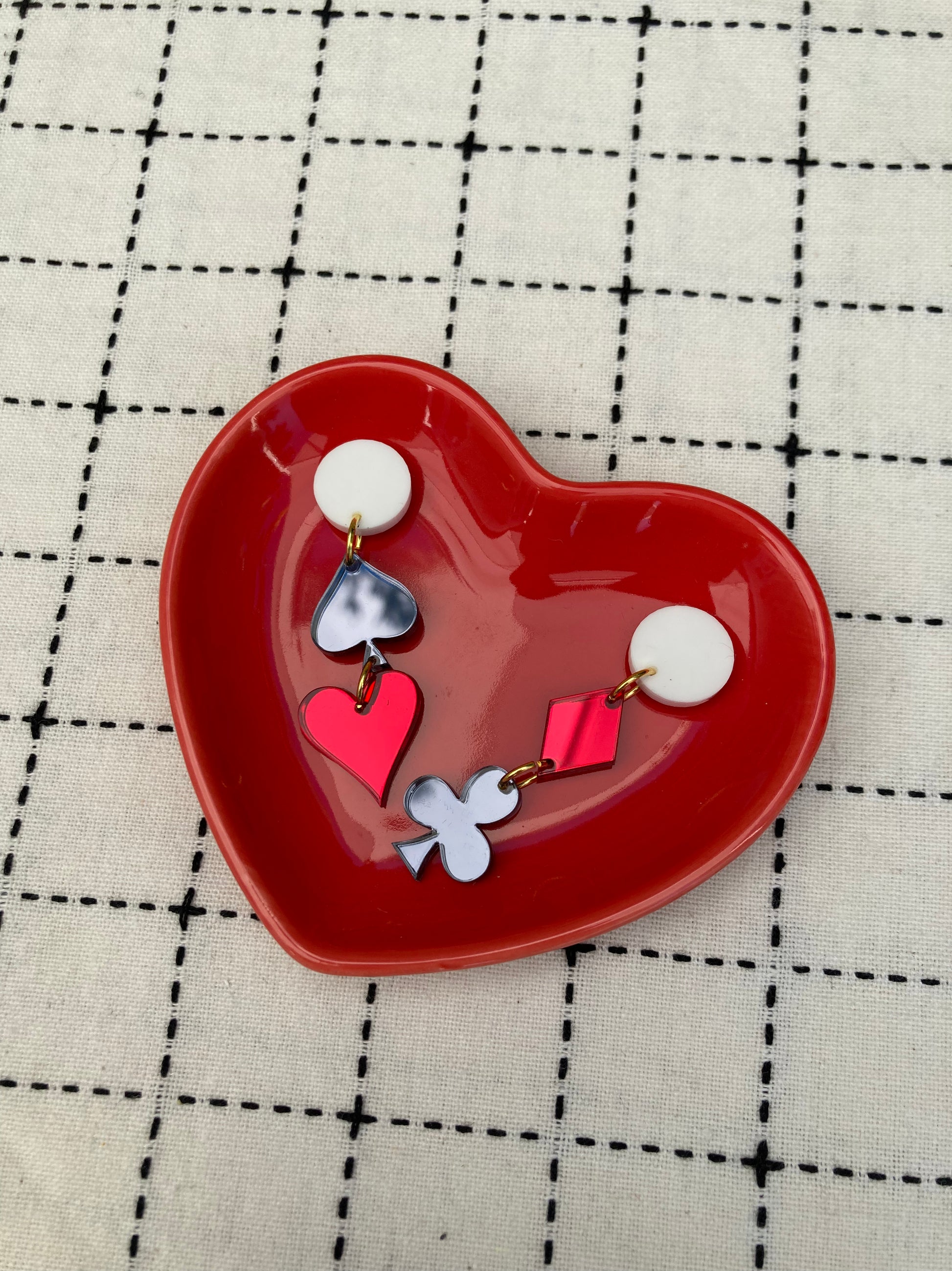 Inspired by playing cards on holiday these earrings feature charcoal mirror acrylic clubs and spades alongside red acrylic mirror hearts and diamonds suspended from white discs to represent a full house! Photographed alongside Hot Lips earrings.