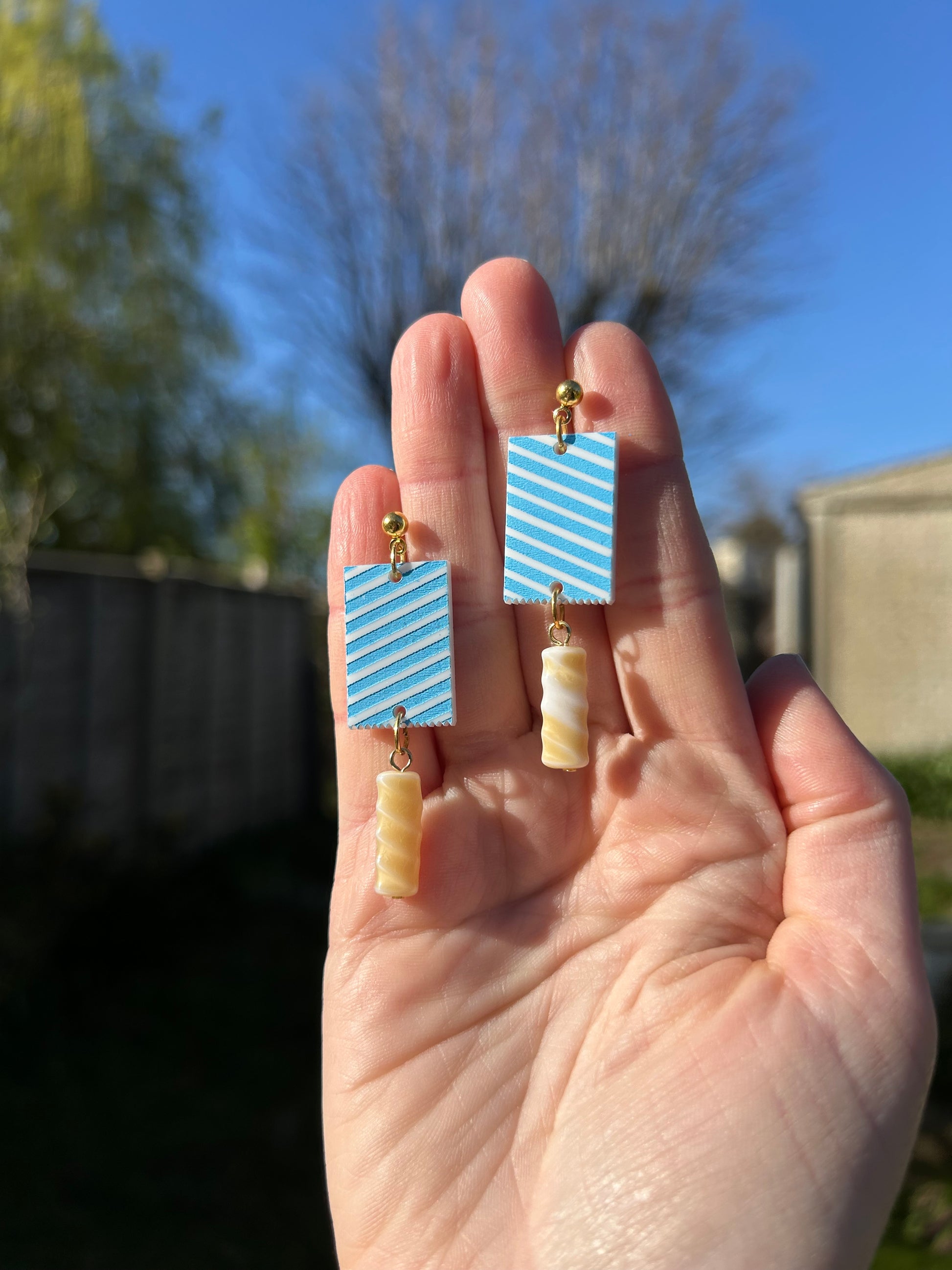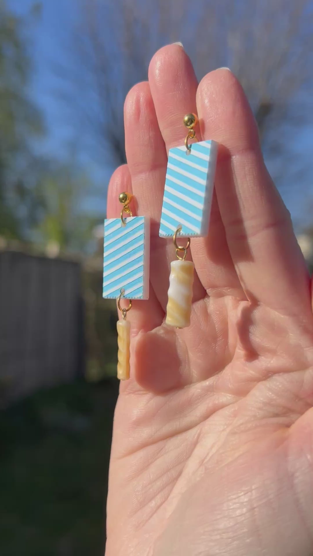 I got these gorgeous glass ridged beads that reminded me of the sausage rolls so I made from acrylic striped bags that remind me of a bakery. On gold stud tops, they're so cute!