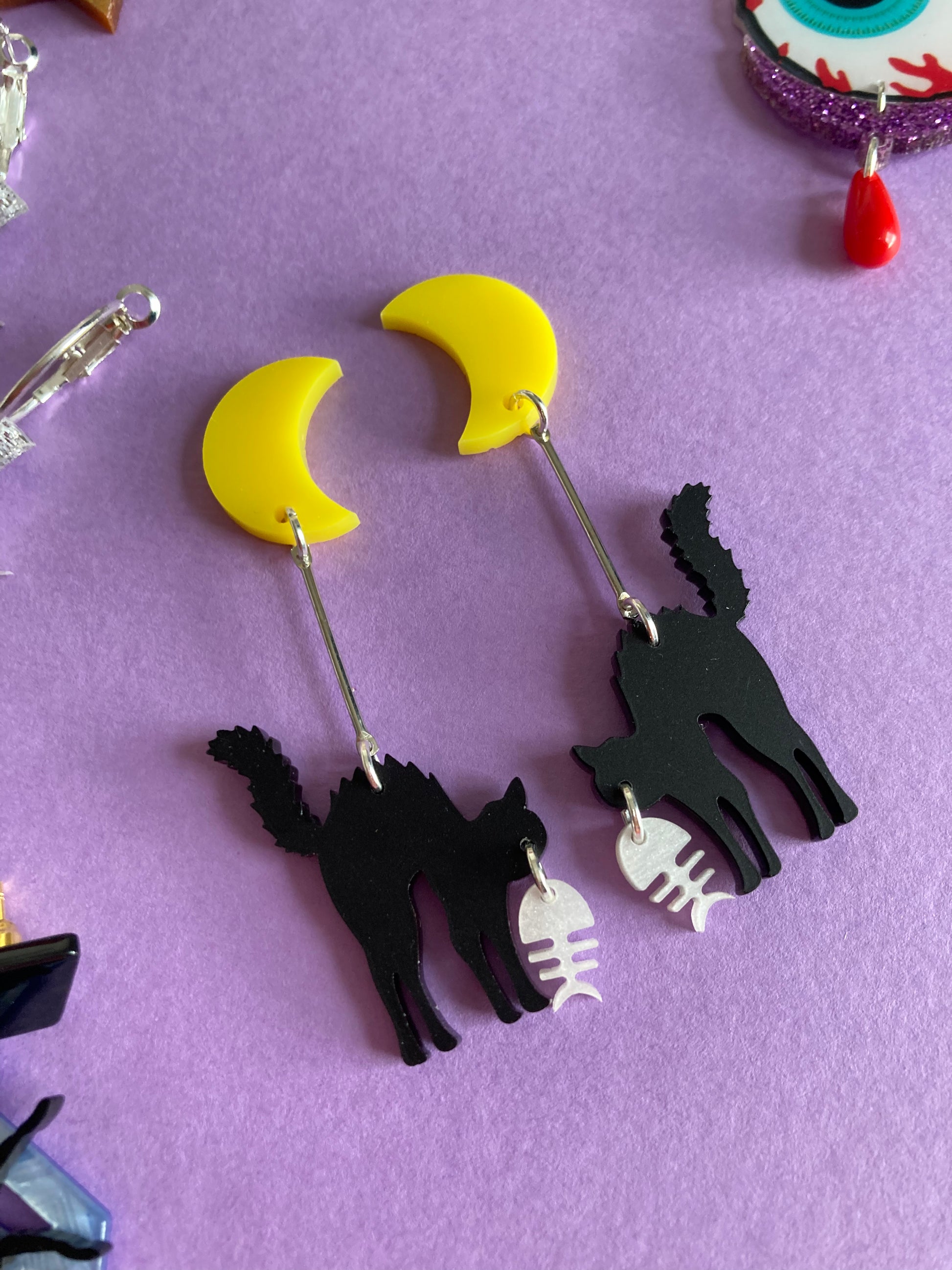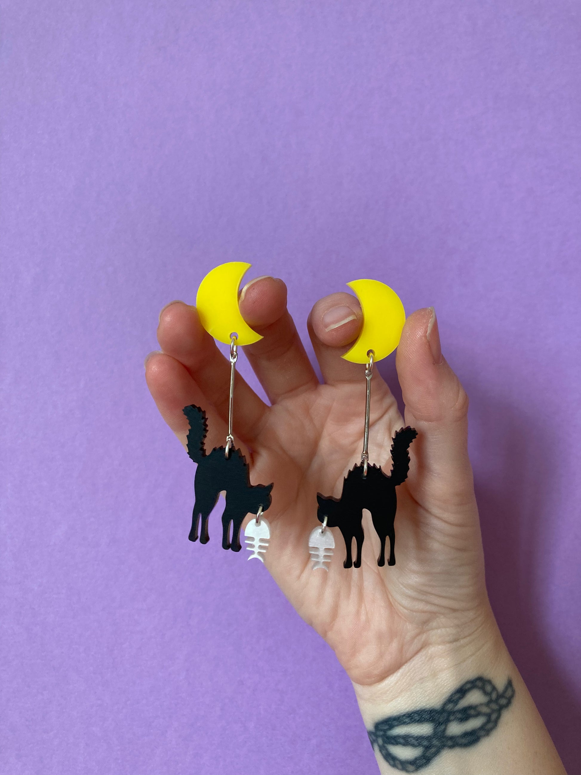 Black cats with white marbles fishy skeleton charms suspended from yellow acrylic moons and silver bar connectors. These are an upgrade from previous scaredy cat earrings.