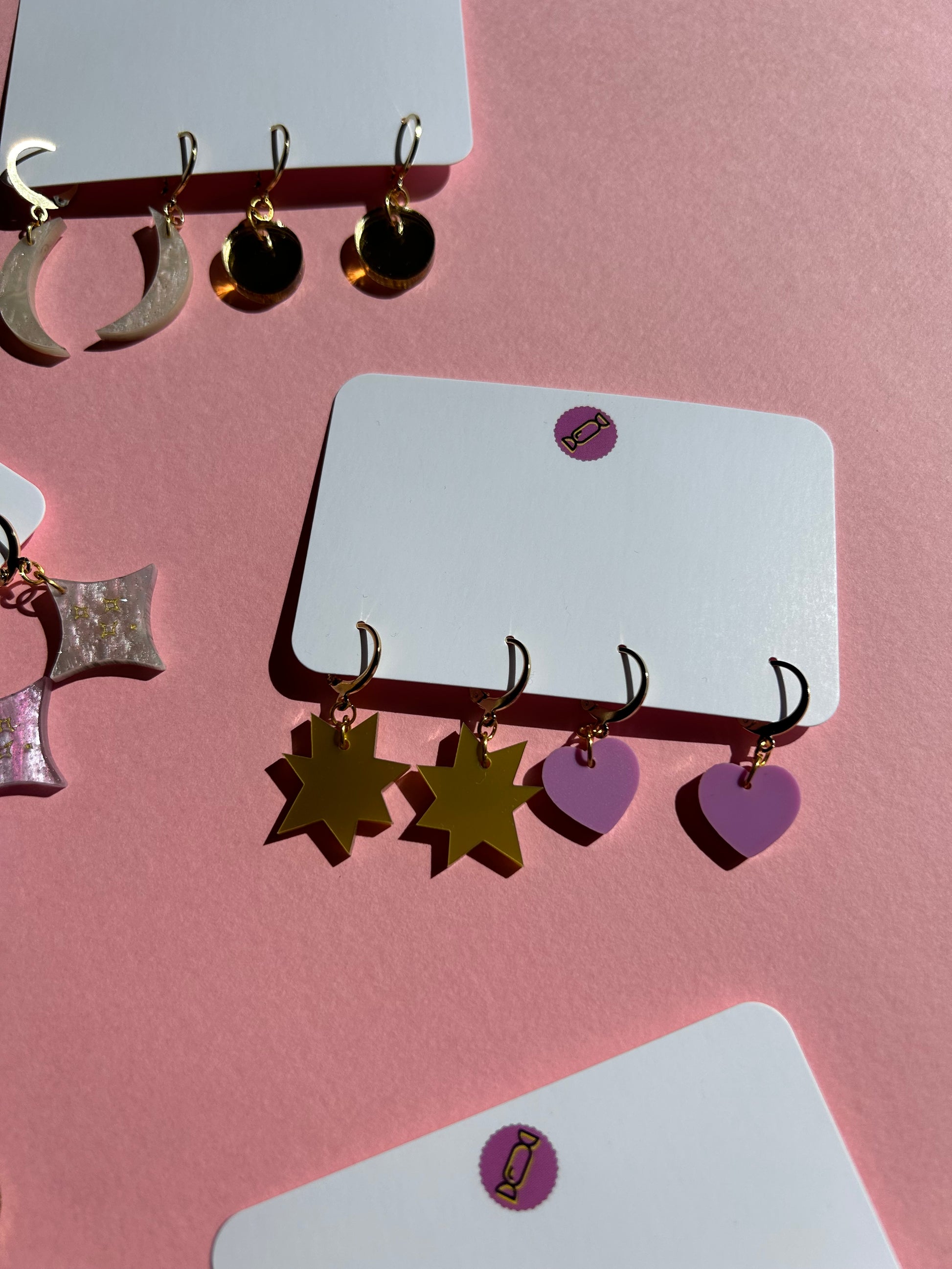 These duo sets are made from laser cut acrylic charms on lever back gold metal hoops. The sets are as follows: