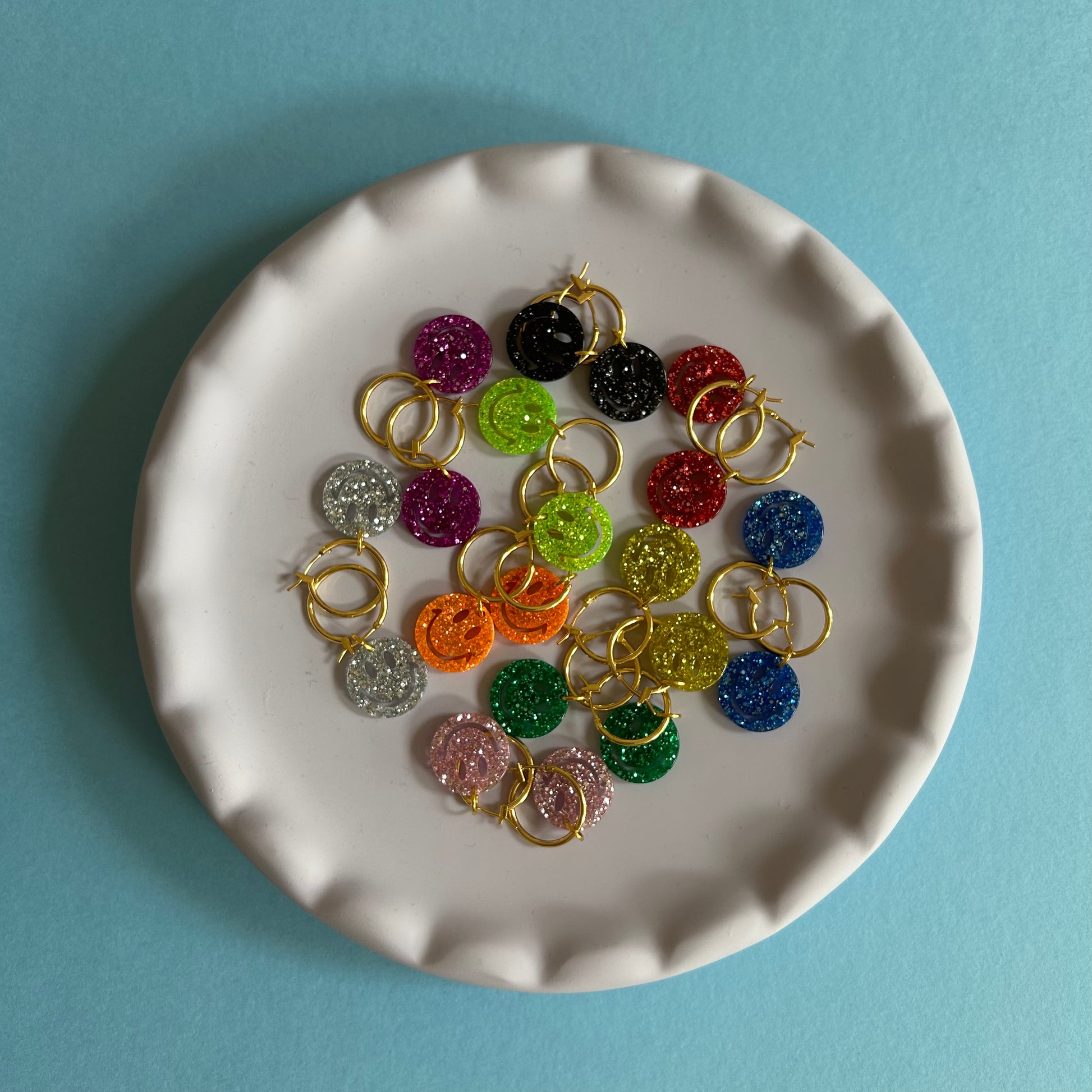 These gorgeous earrings are small but mighty in flair! Glittery shiny acetate smiley faces on gold metal hoops in the following colours: