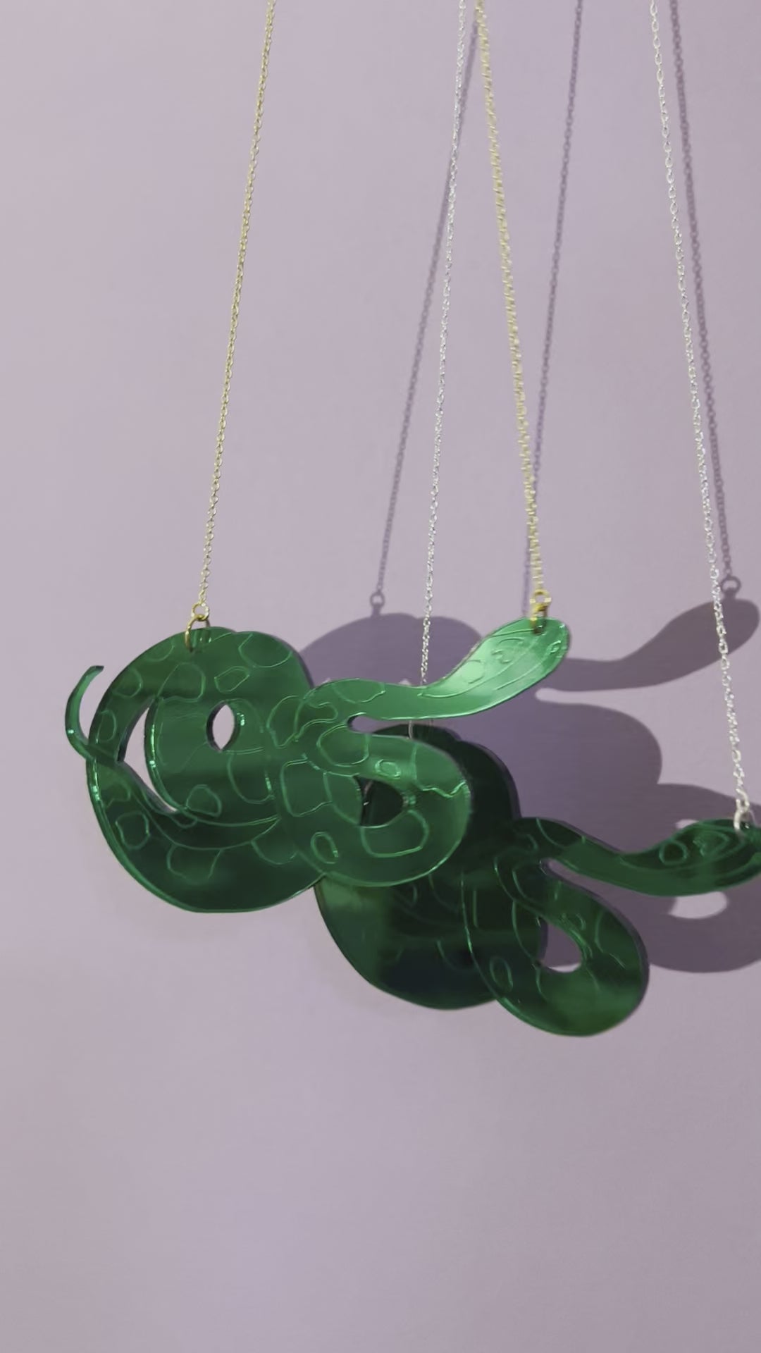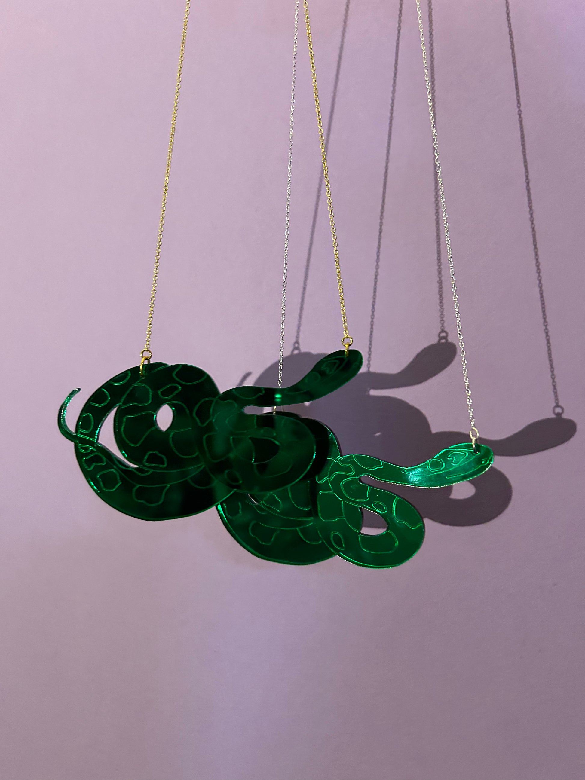 Green mirror acrylic coiled snake necklaces on either silver or gold metal chain with a lobster clasp.