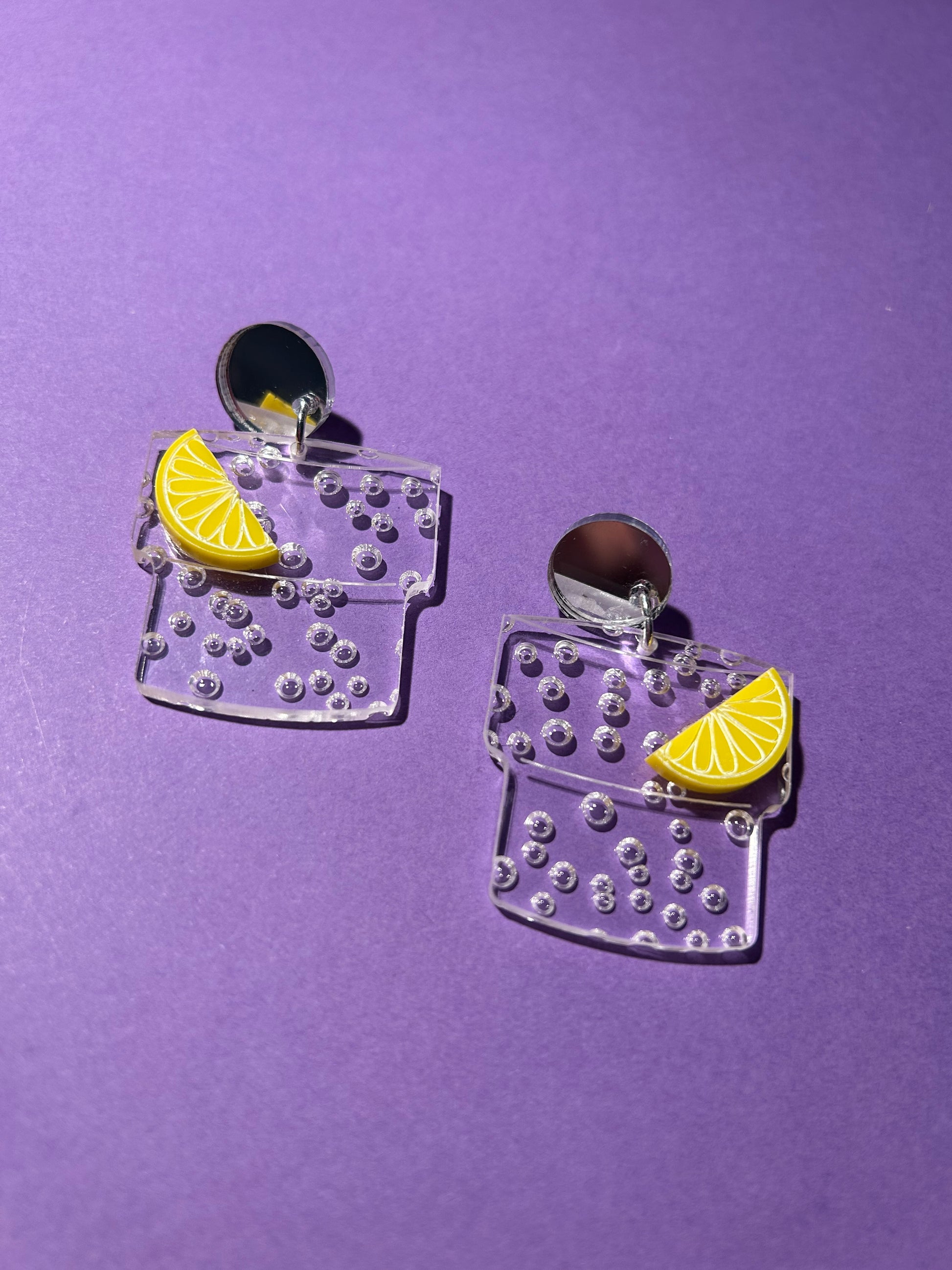 I got this bubble effect acrylic and immediately knew it would look good as drinking glasses. These little tumblers also feature a yellow acrylic lemon wedge and remind me of G&Ts or a crisp soda with lemon. The are hung on silver mirror discs with silver metal findings.