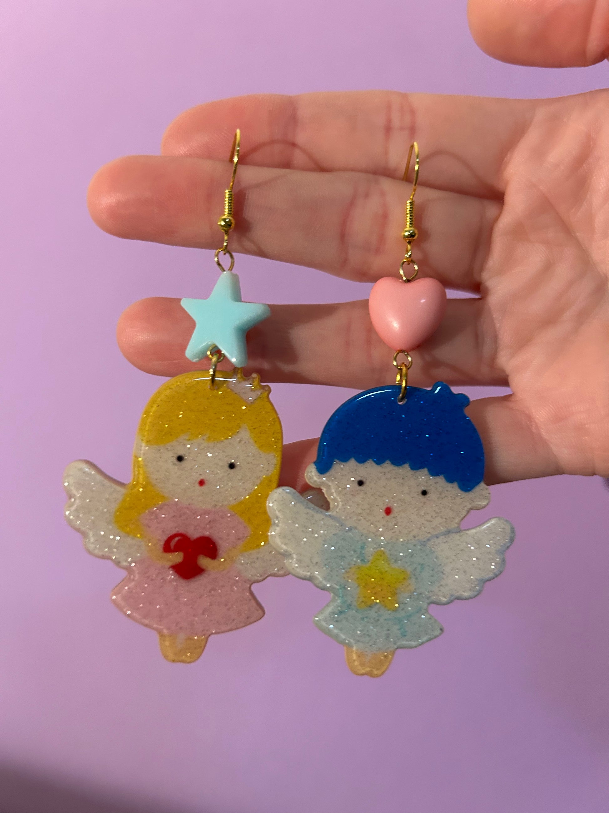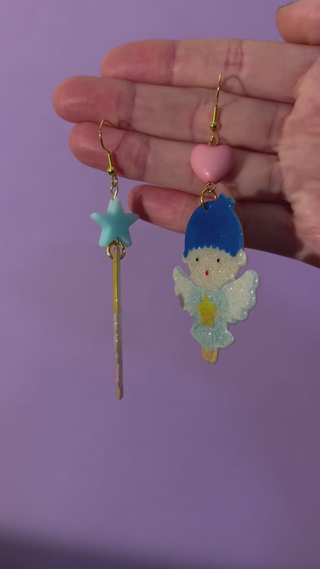These cuties were sourced years ago and I finally decided how they should look! With plastic heart and star beads on gold metal fish hooks. Each pair features a blue-haired fairy and a yellow-haired fairy :)