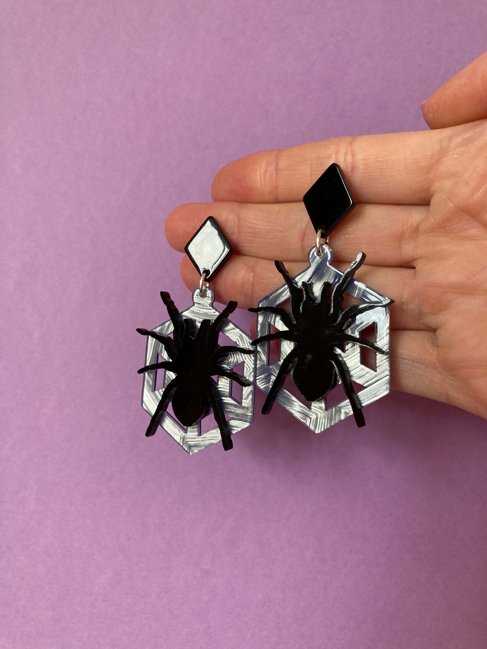 Black acrylic spiders on blue shimmer webs suspended from black acetate diamonds! They're giving me Spiderman vibes?!