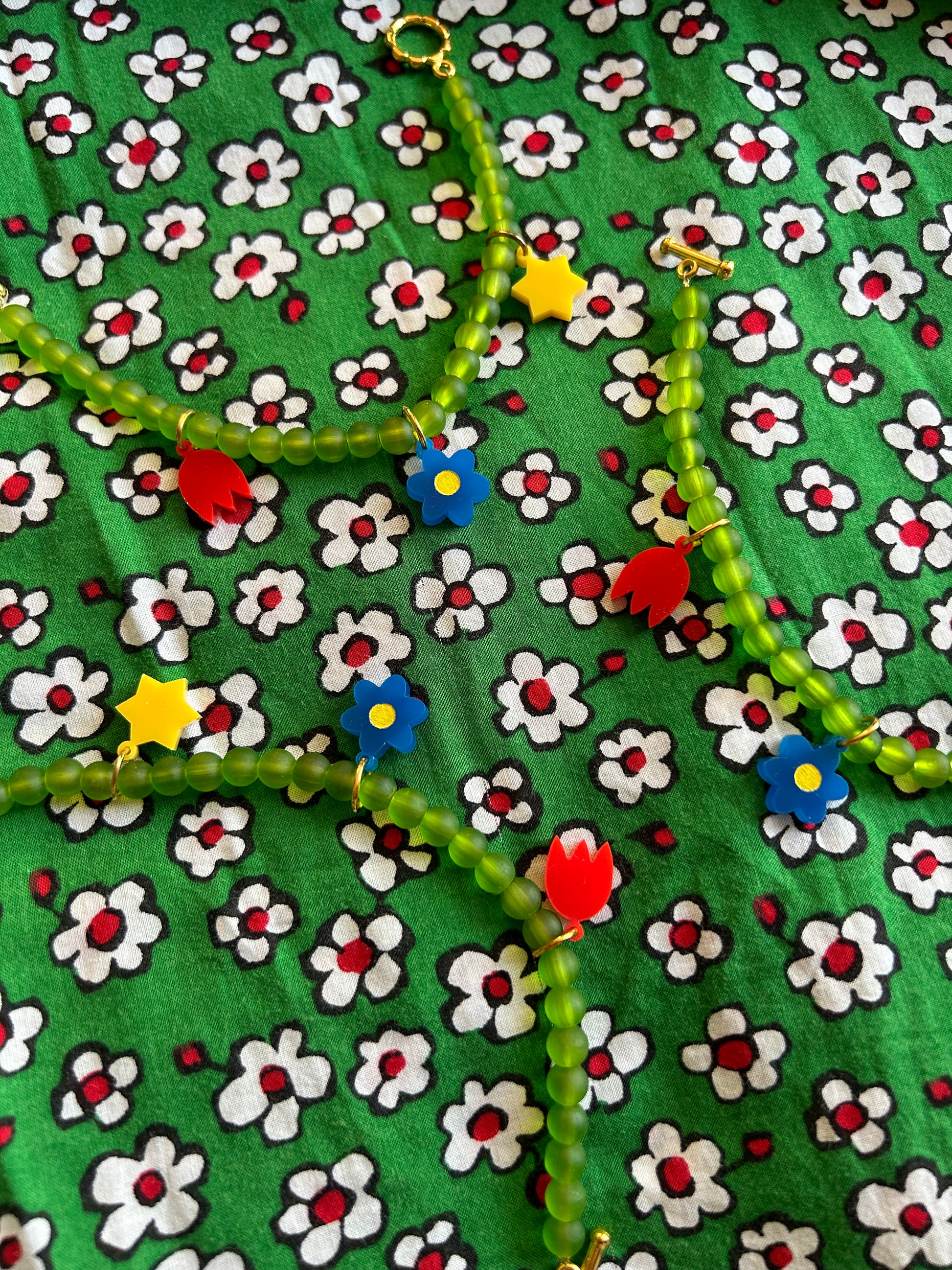 Spring is here and so are these gorgeous little bracelets featuring frosted green glass beads, a floral clasp and laser cut acrylic charms including a red tulip, a blue daisy and a yellow star.