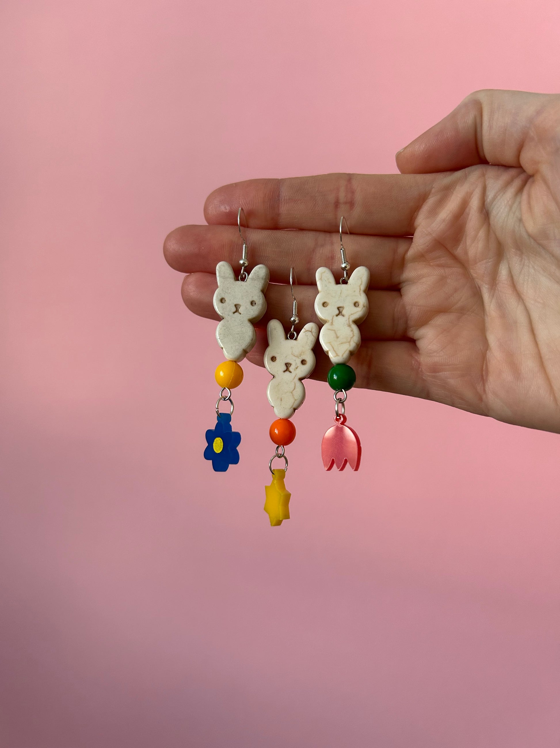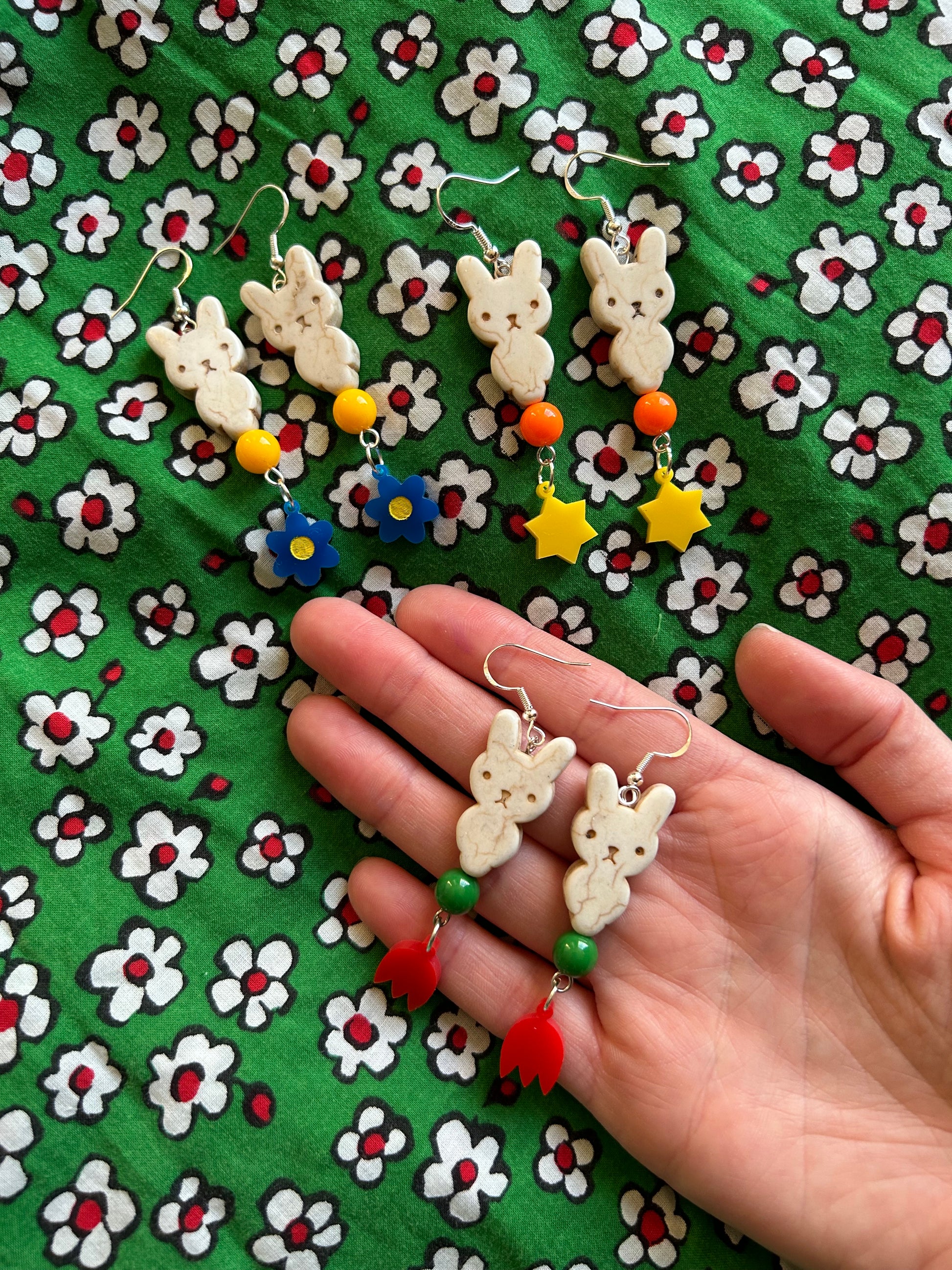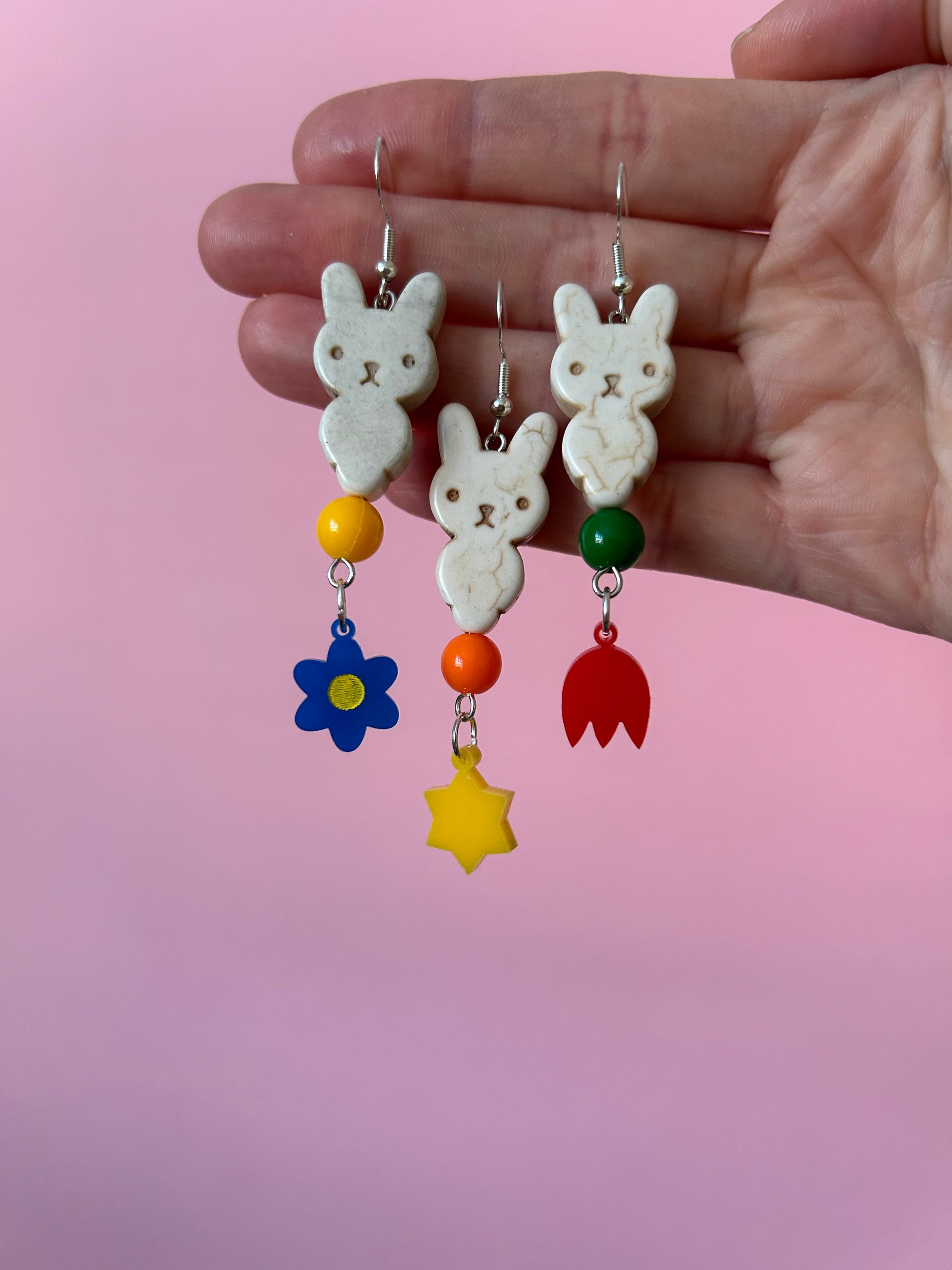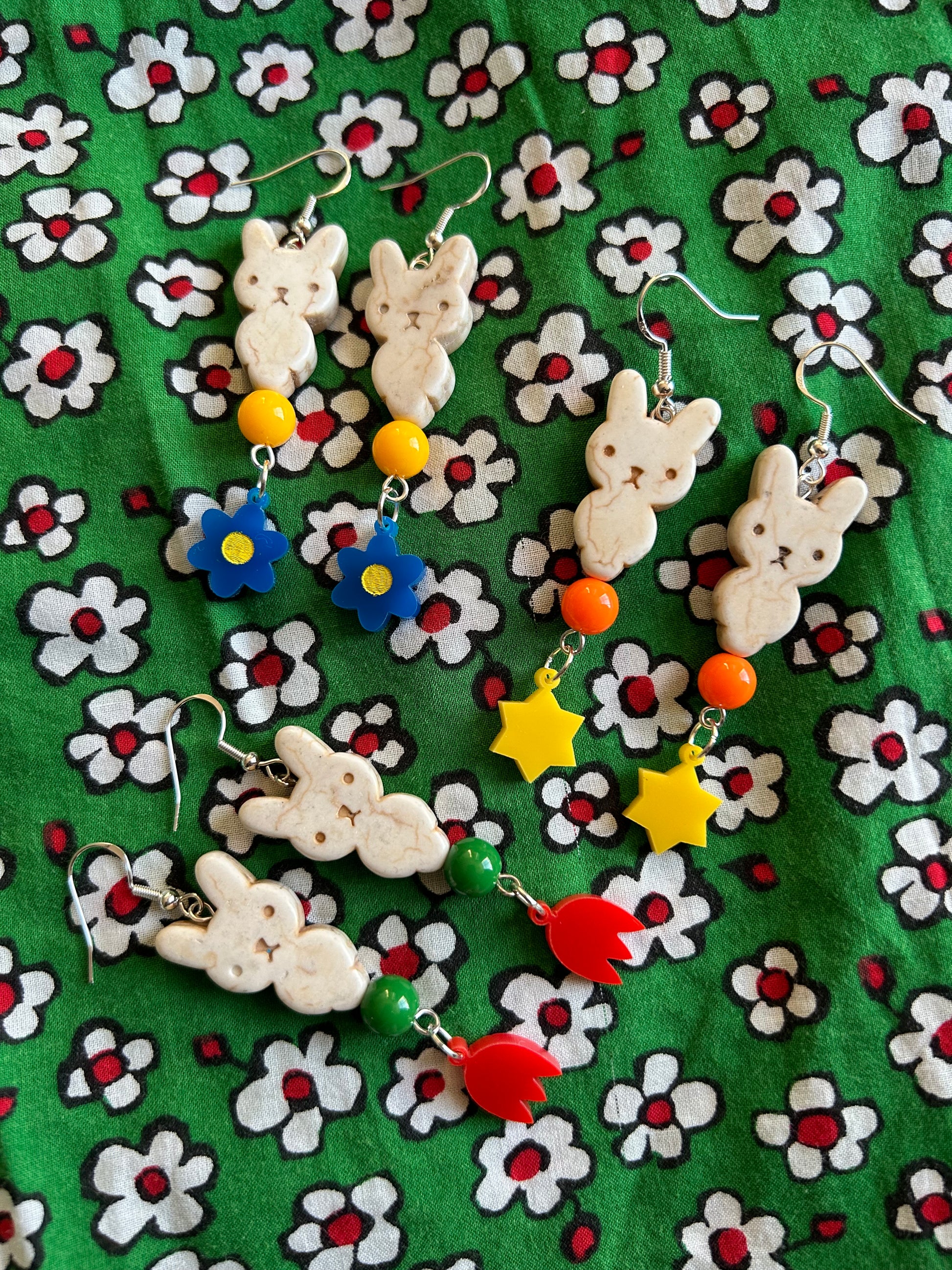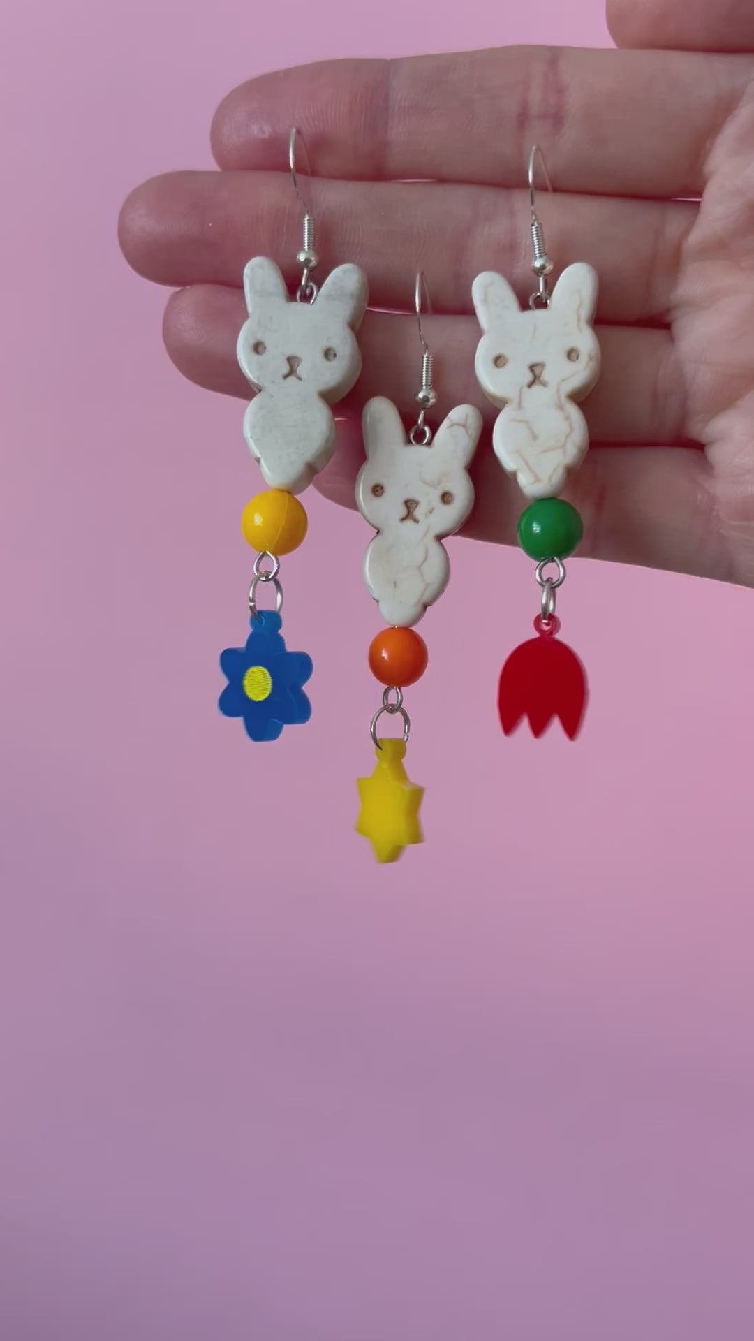 Spring has Sprung! These gorgeous earrings are made from stone bunny beads and laser cut acrylic charms. The blue daisy charms are mixed with yellow beads, the yellow stars are mixed with orange beads and the red tulips are mixed with green beads.