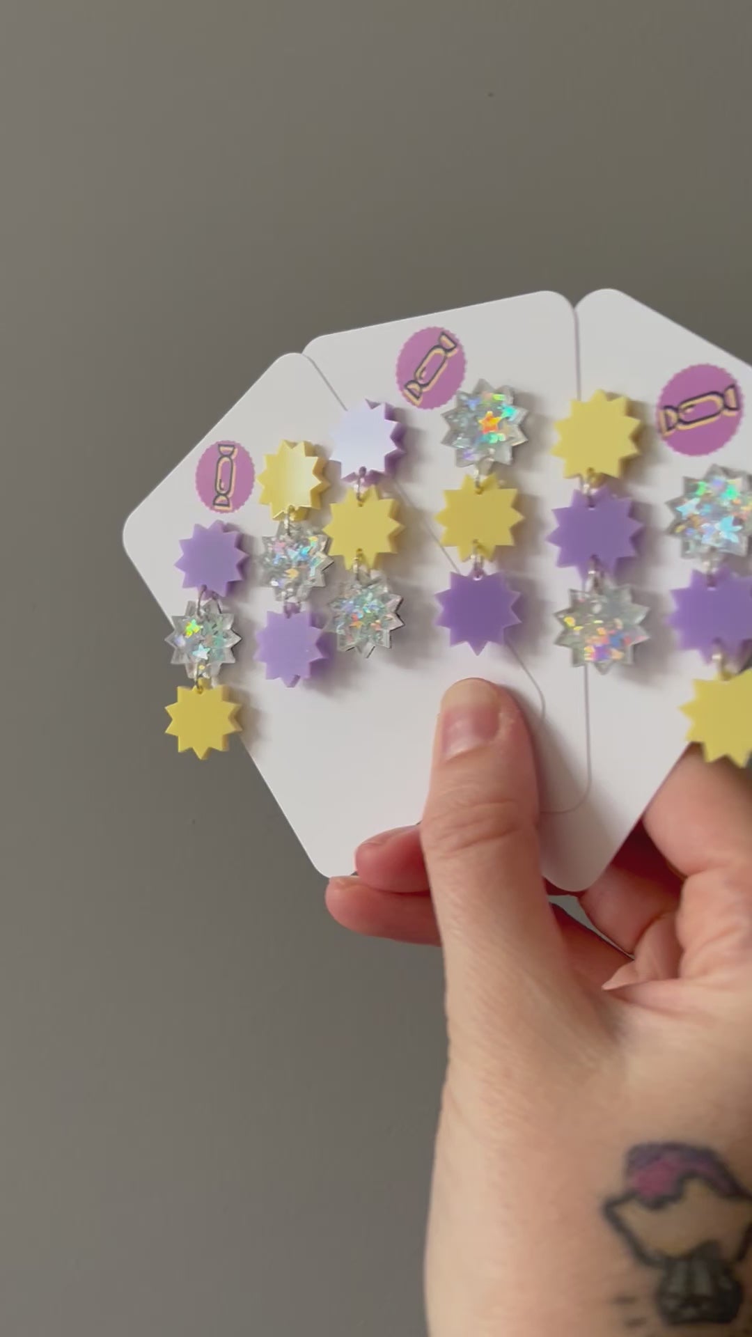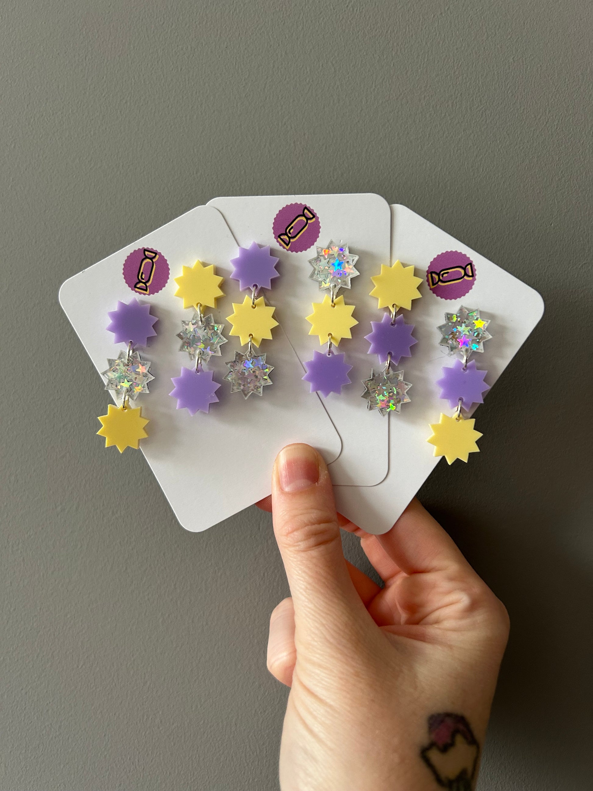 Shiny lilac, matte pastel yellow and silver star holographic glitter trio of acrylic starbursts make for a funky pair of earrings! I am planning on making other colour combos of these as I think they're gorgeous :) They are lightweight and really lovely.