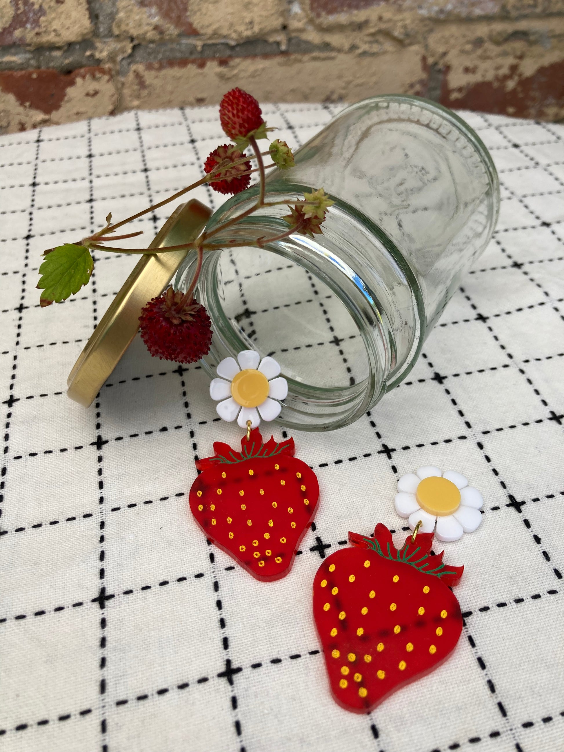 These are a summer favourite as they feature two seasonal delights that appear in my garden; daisies and strawberries! Red frosted acrylic strawberries are suspended from white shiny acetate daisies.