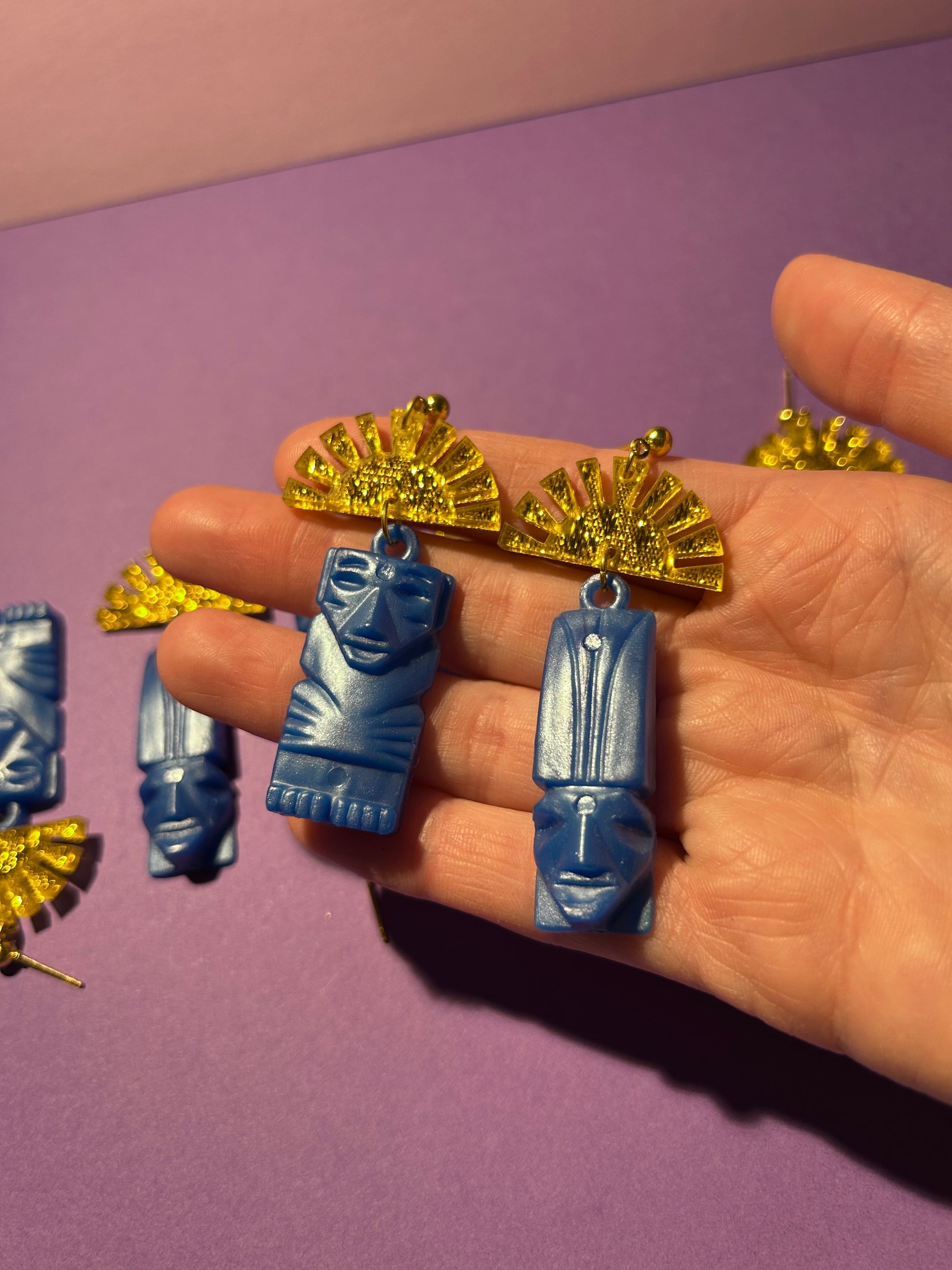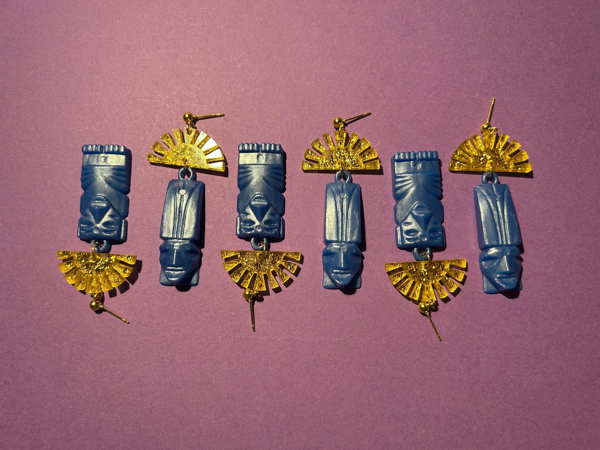 These blue shimmery plastic tiki head charms are vintage and super cute! They are combined with gold fabric acrylic sunrises and hung on hooks.