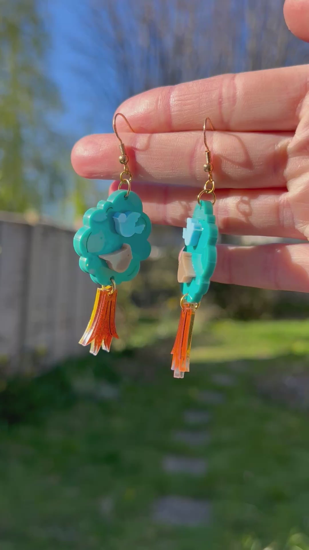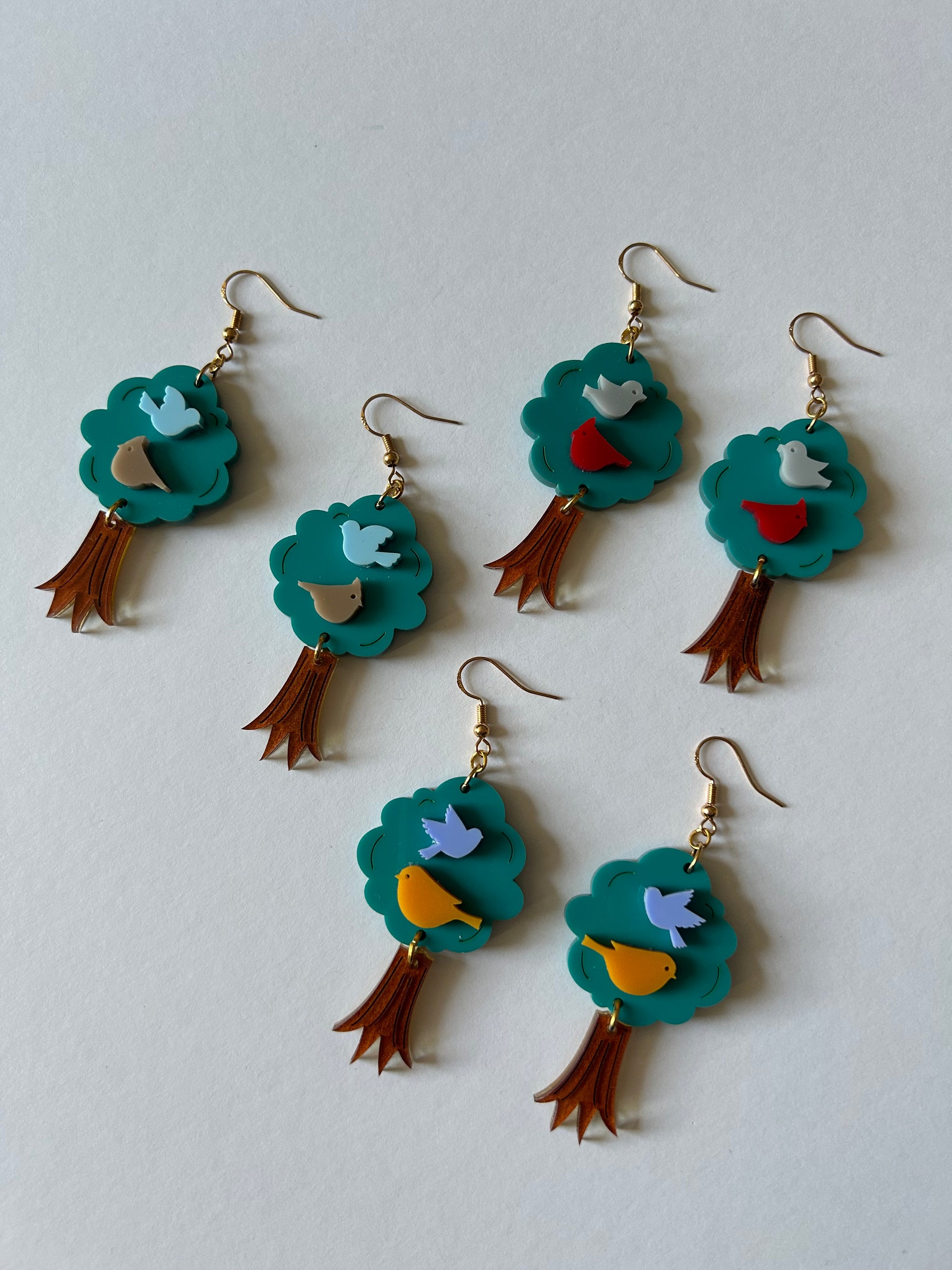 These are little teal acrylic trees with teeny acrylic birds and wood print acrylic tree trunks on gold metal hooks. Each pair is different based on the bird colours: