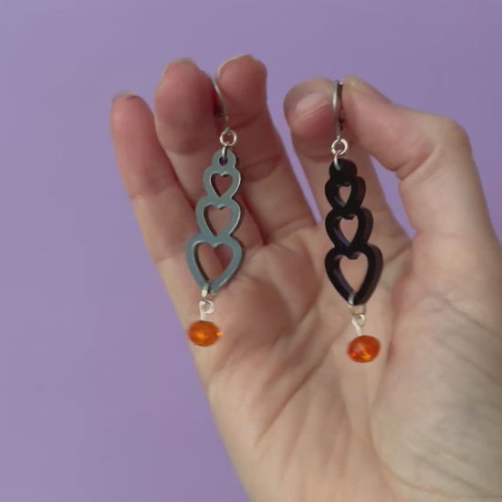 Black triple heart dangly acrylic earrings with gorgeous glass faceted orange beads for a Halloween twist!