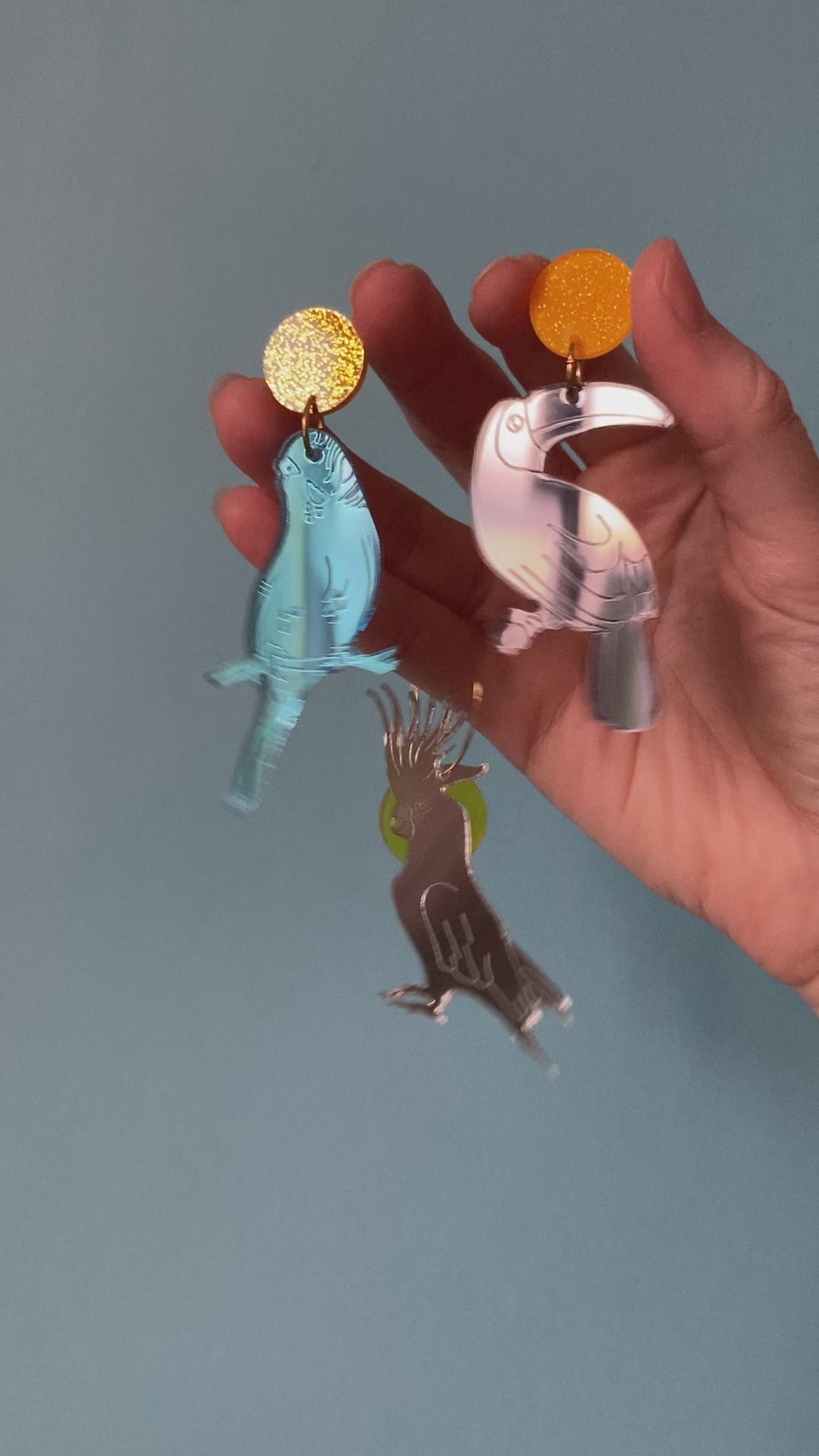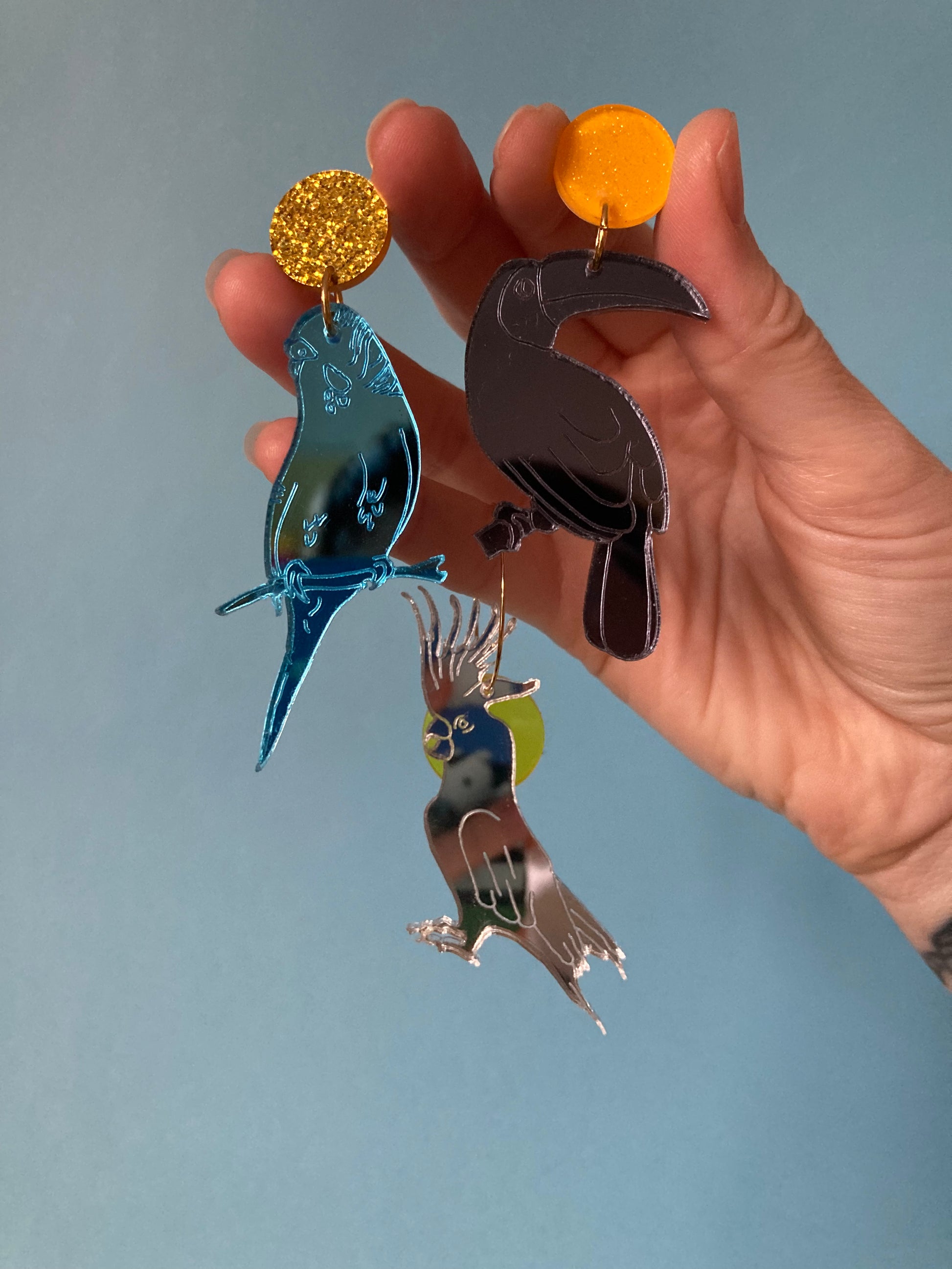 These tropical beauties feature three awesome birds in mirror acrylic in the following options: