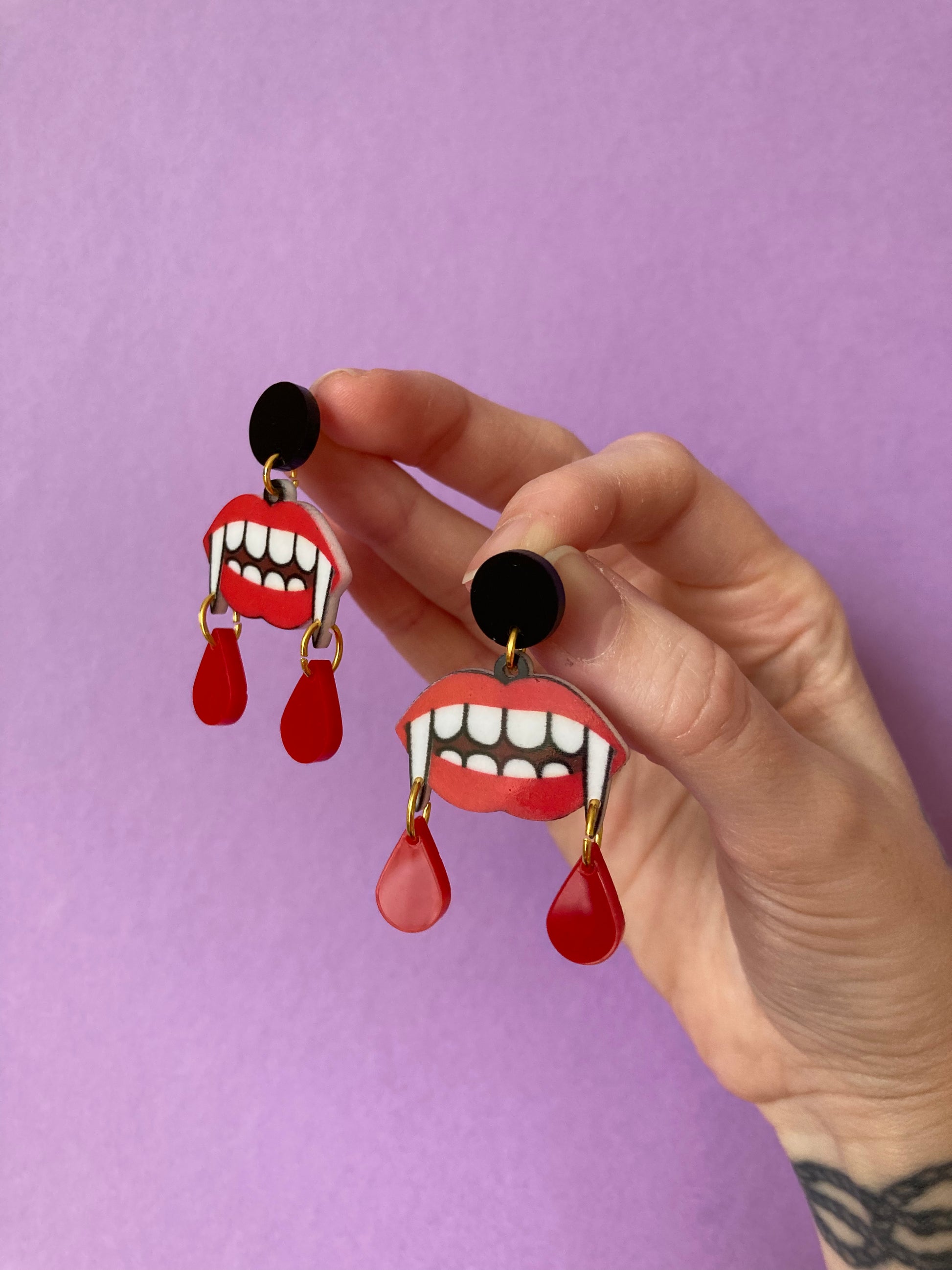 Vampire teeth printed acrylic with dangly acrylic red blood drops suspended from mini black acrylic discs.