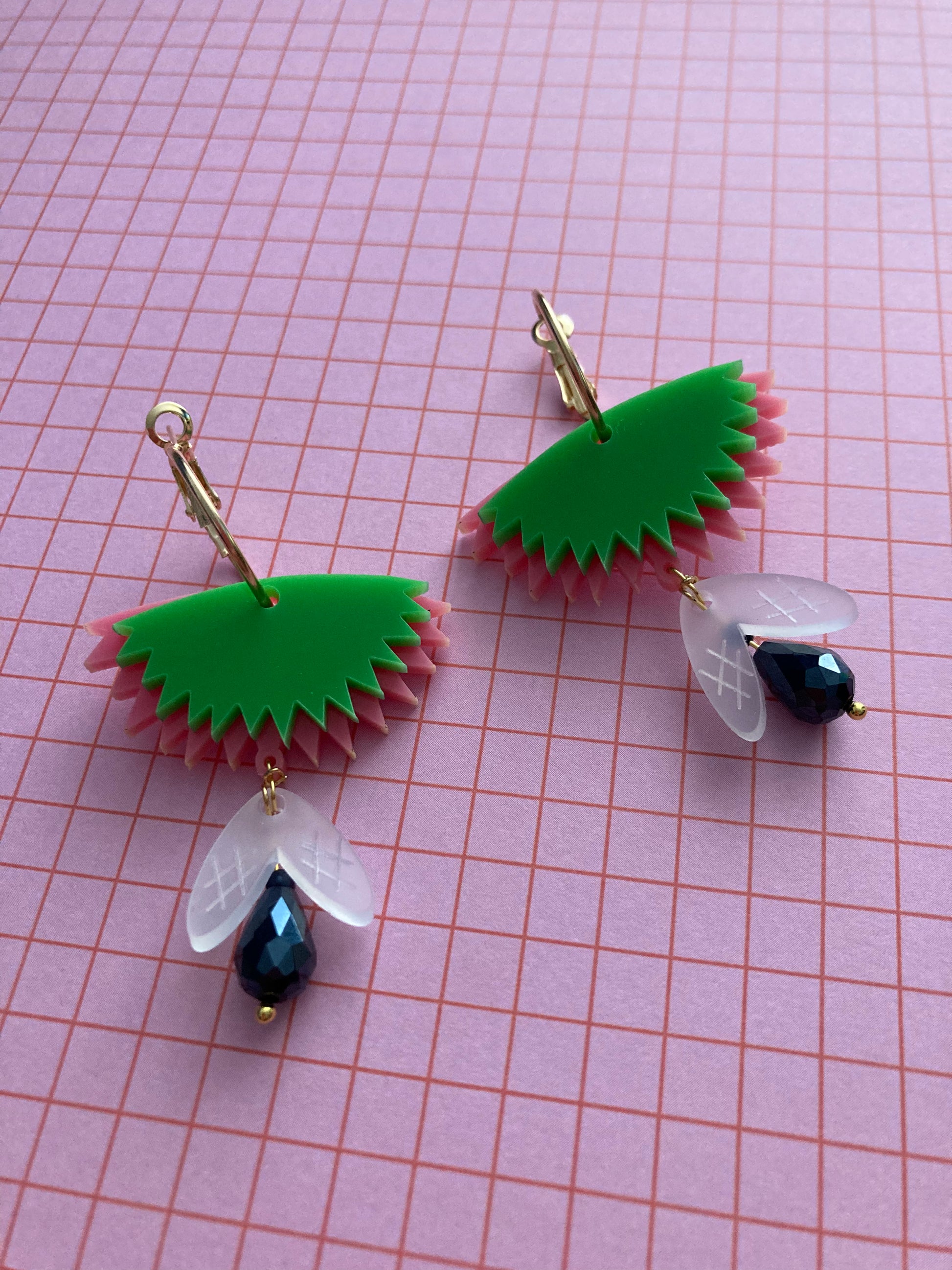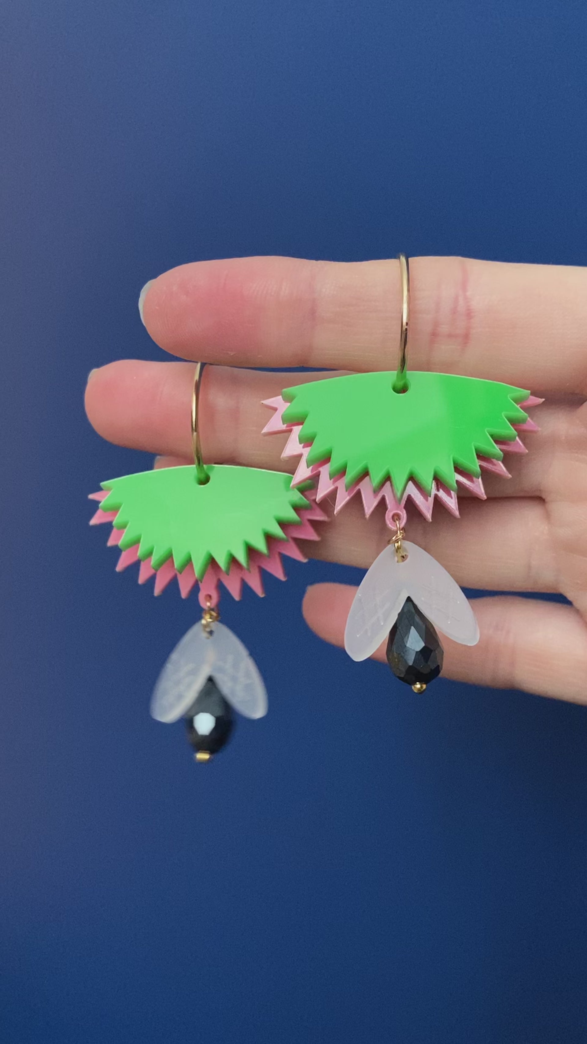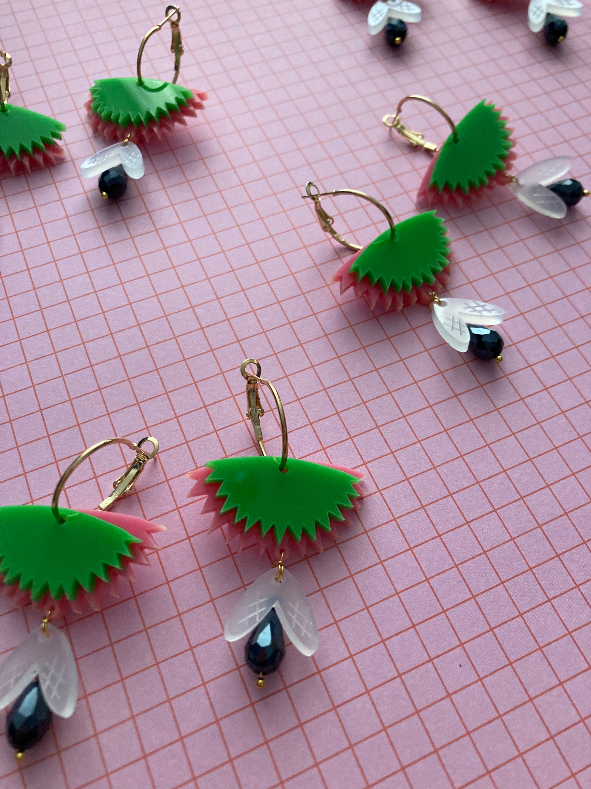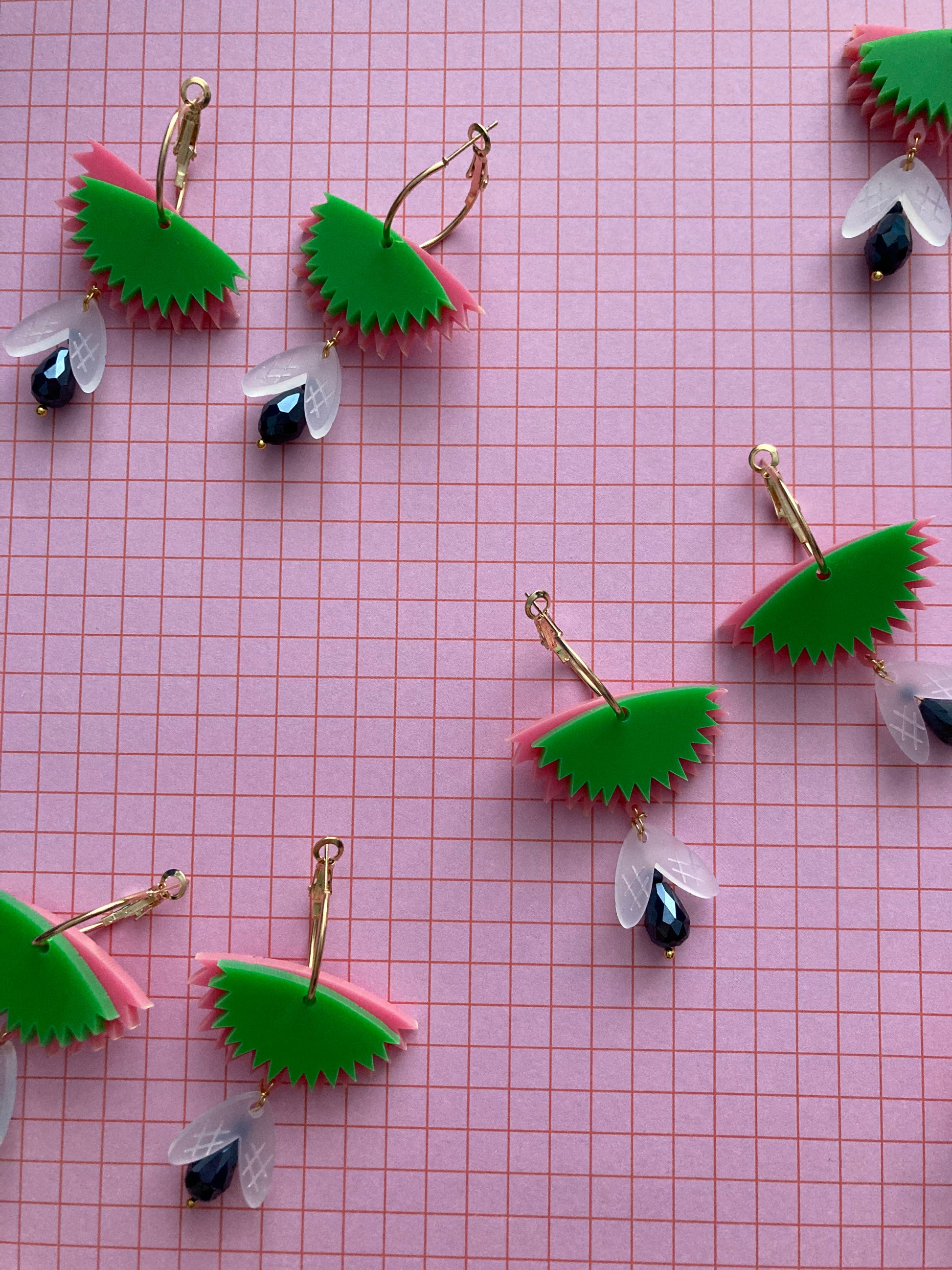 I bought a Venus Fly Trap plant for our kitchen as we kept getting fruit flies, needless to say the plant is doing the trick and makes for some great earrings. Green and pink spiky acrylic semicircles stacked onto gold metal hoops with frosted etched acrylic wings and iridescent faceted beads to mimic houseflies.