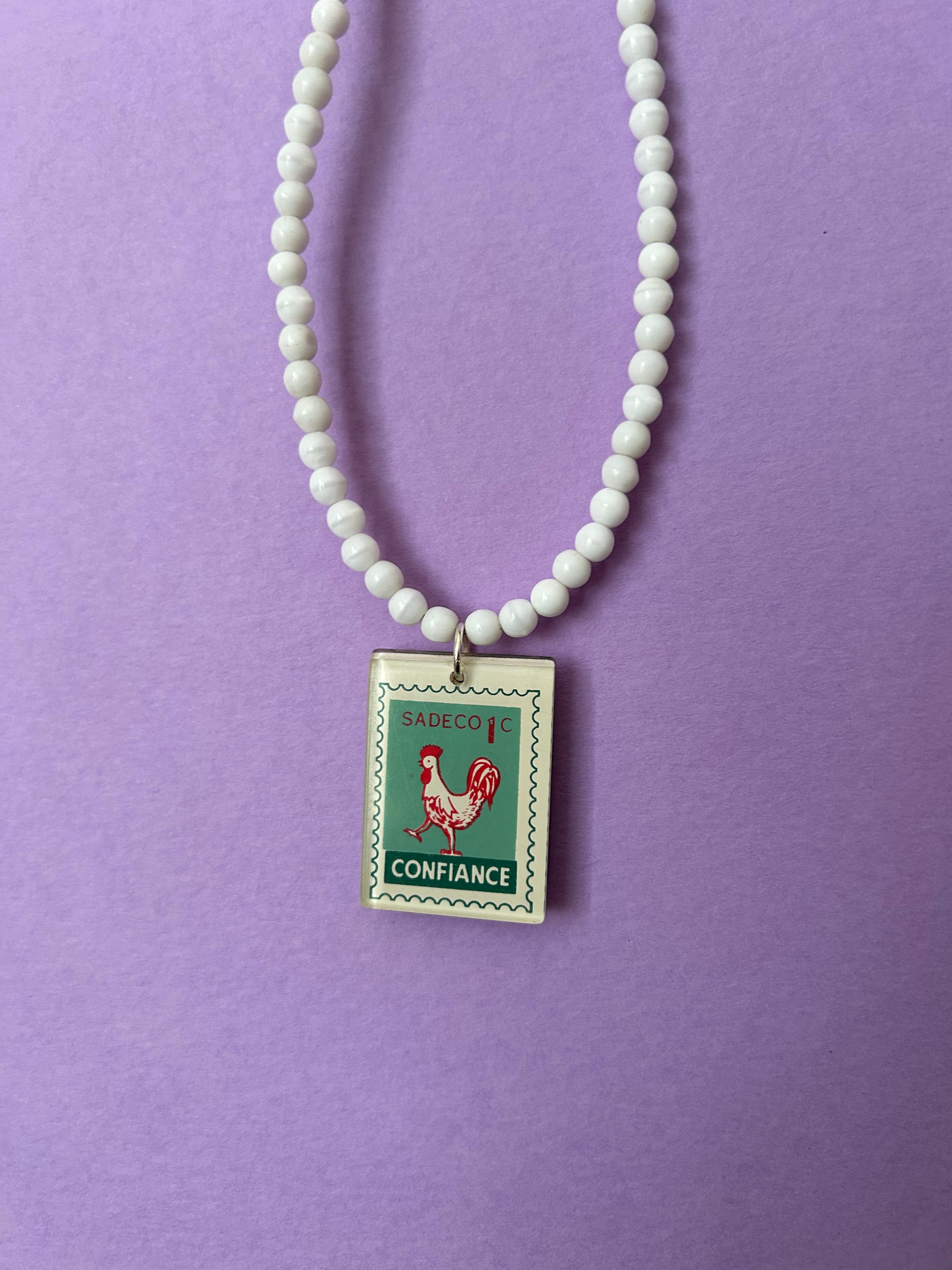 9. Confiance Stamp Pendant with white glass beads.