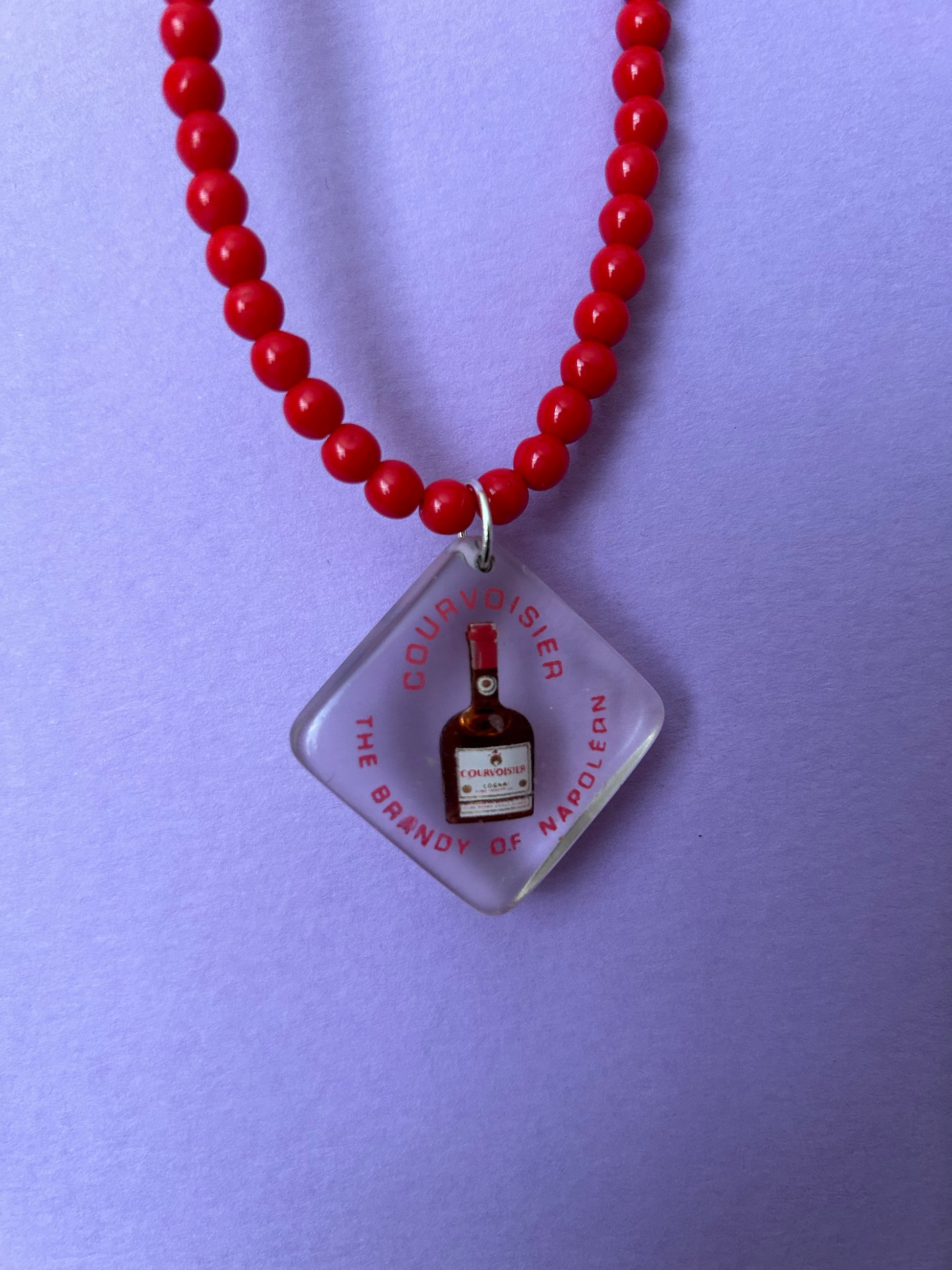 5. Courvoisier Brandy Pendant with red glass beads. There is actual liquid inside the bottle!
