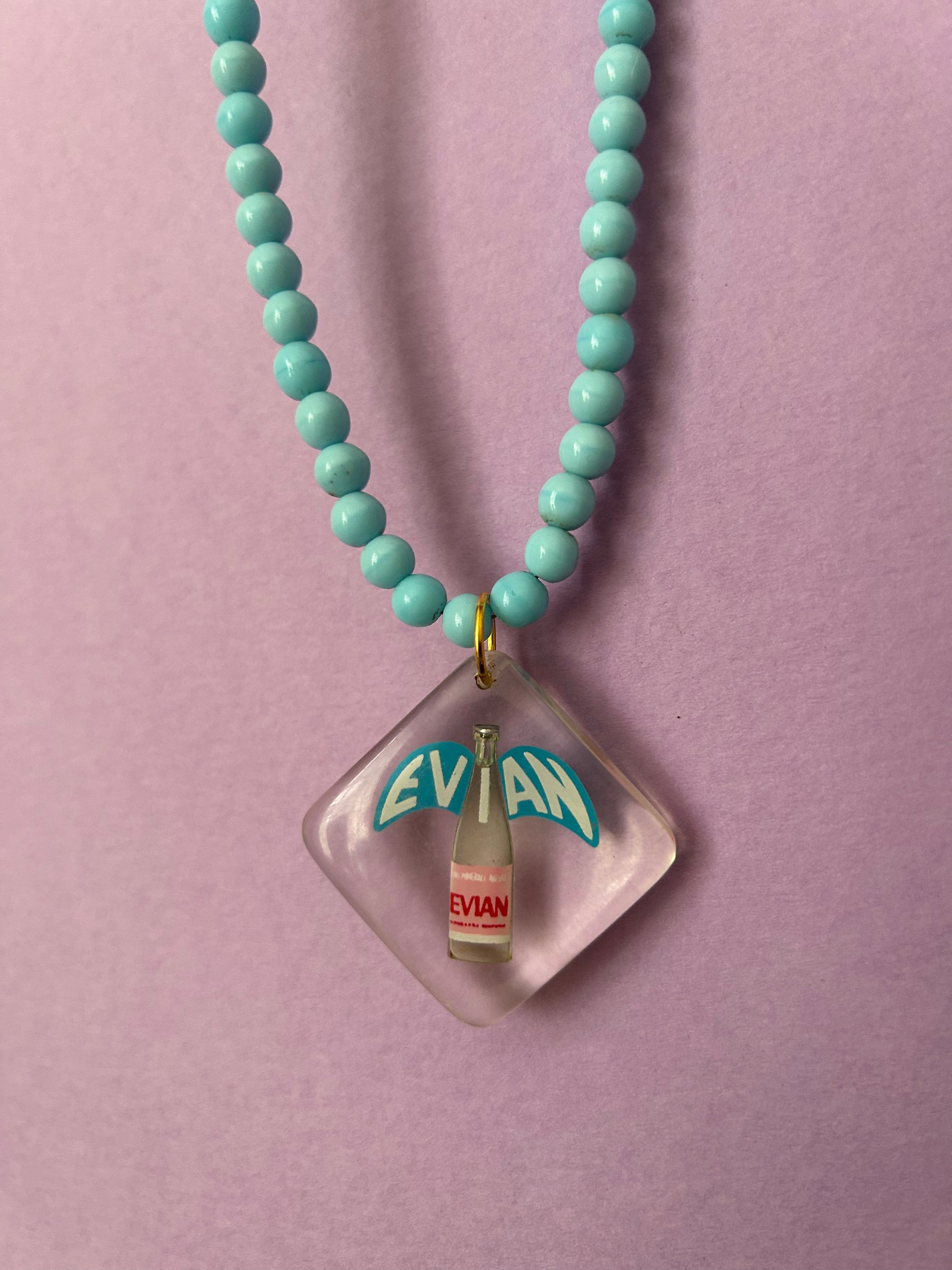6. Evian Bottle Pendant with aqua blue glass beads. There is actual liquid inside the bottle!