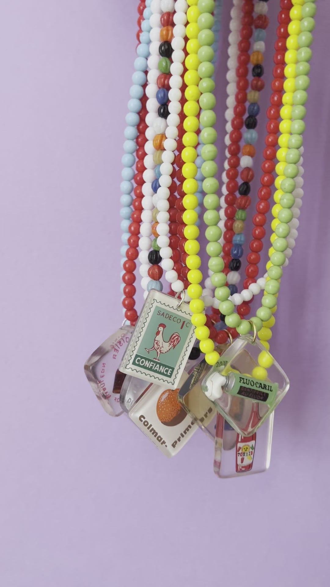 These are unique, colourful and gorgeous! They're made from vintage French resin advertisement keyrings threaded on strong beading wire with glass beads. Someone necklaces have been extended using plastic beads either side of the clasp and won't be seen when worn. Due to the age of the keyrings there may be some minor imperfections in the resin. These are one-of-a-kind and options are as follows: