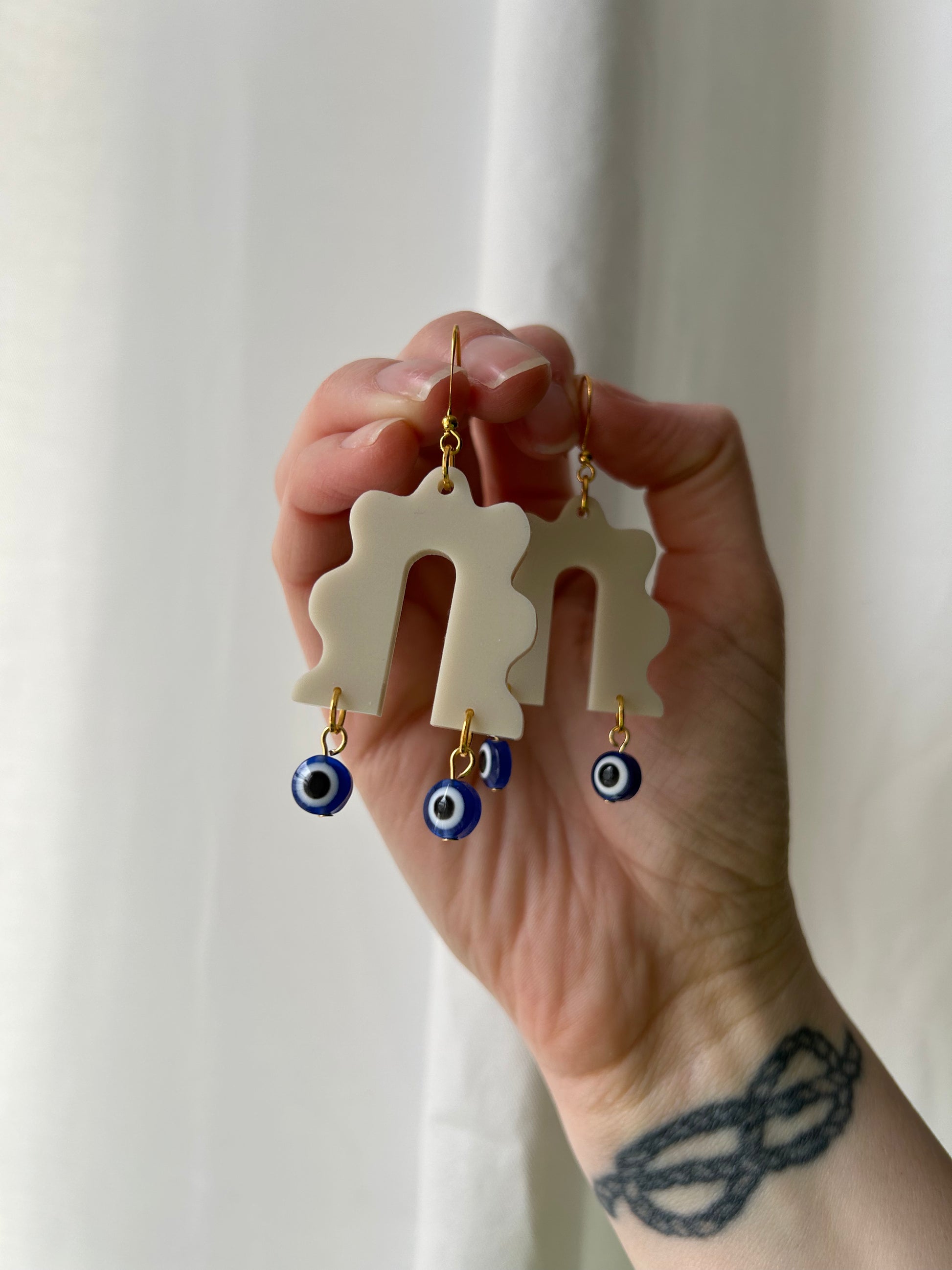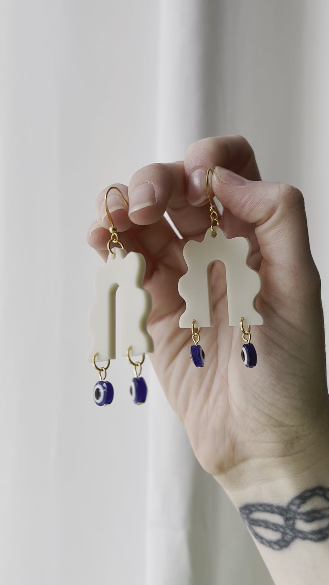 I love love love these! Matte stone acrylic wavy arches with dangly glass eye beads. These are hung on gold metal hook findings and are a gorgeous addition to the Grecian Collection