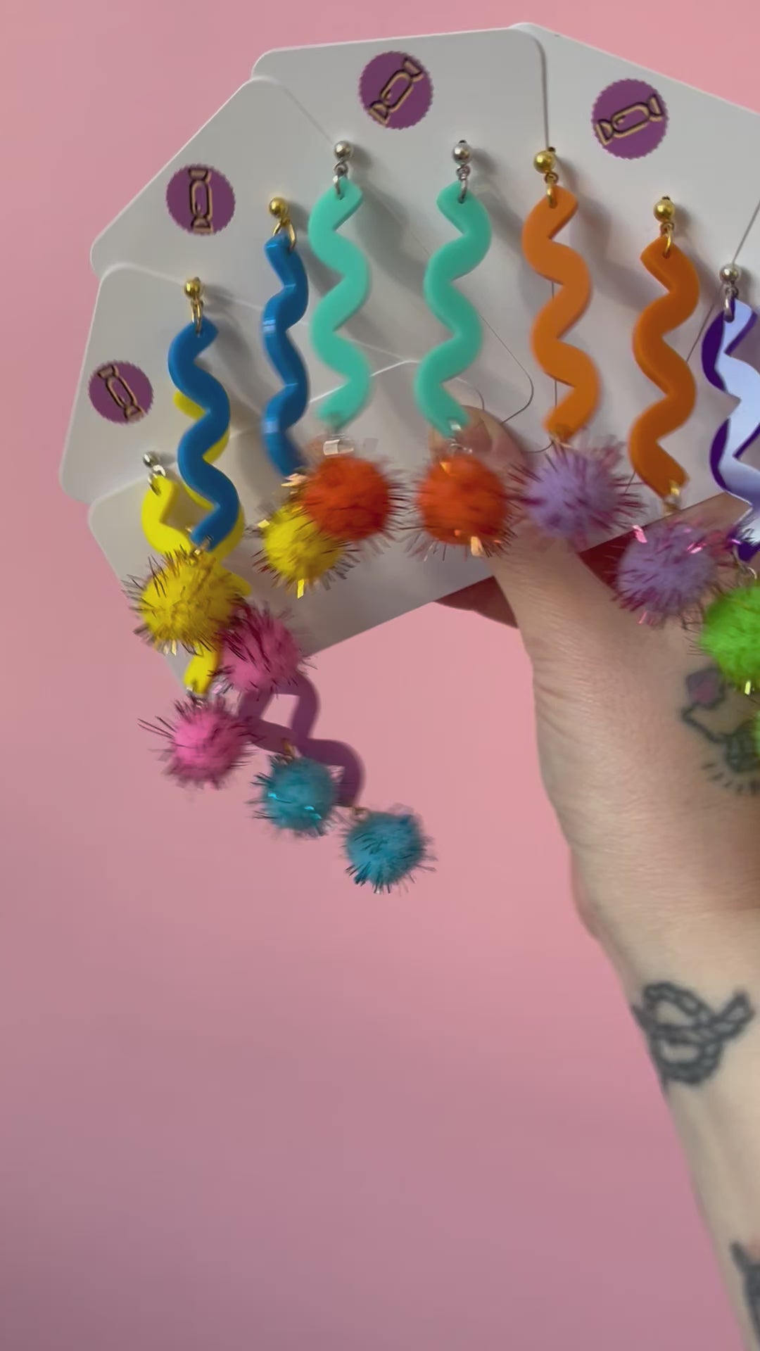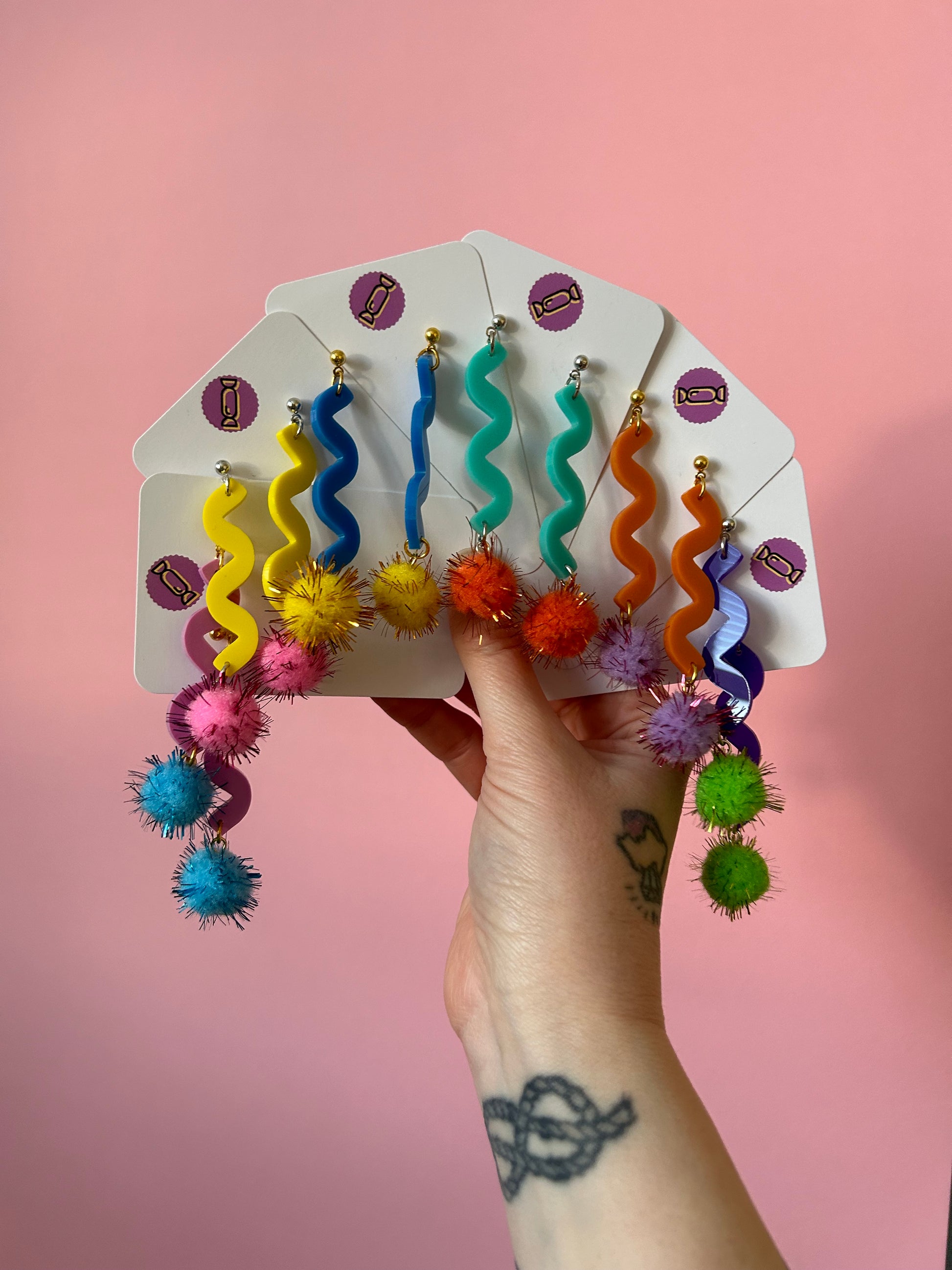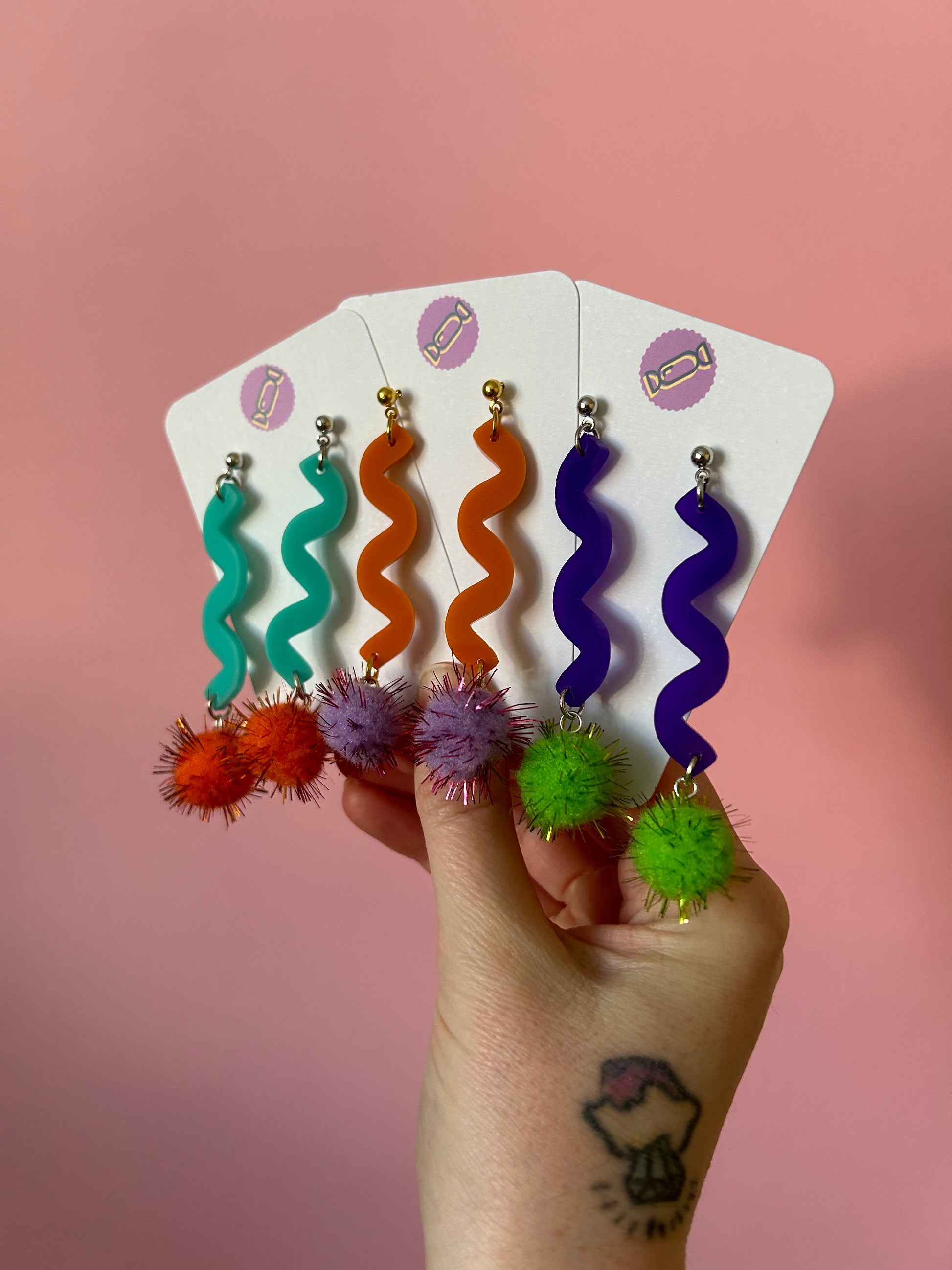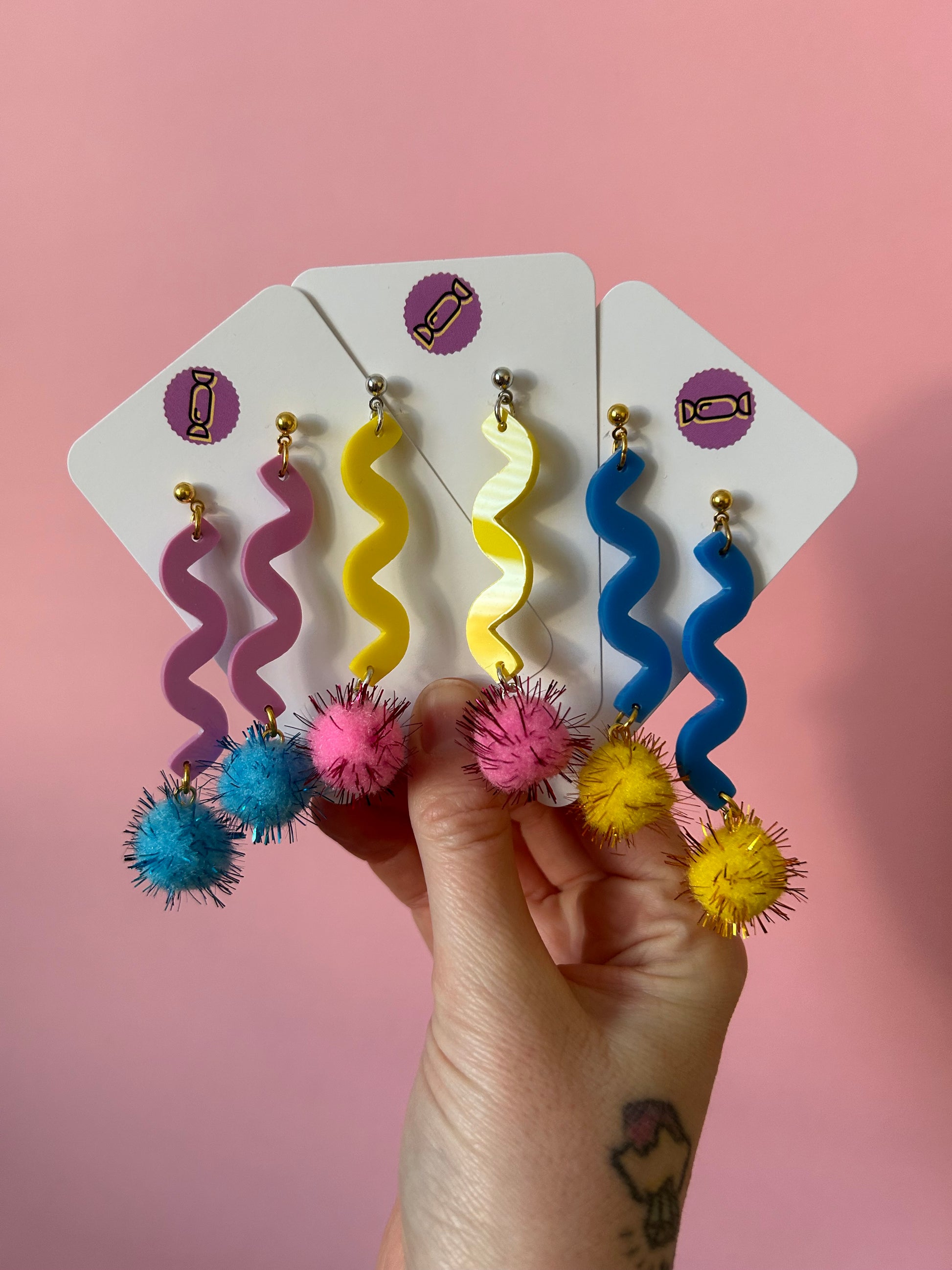 These are the perfect party earrings with wavy acrylic charms and tinsel pompoms metal dot studs. The colour combos are as follows:-