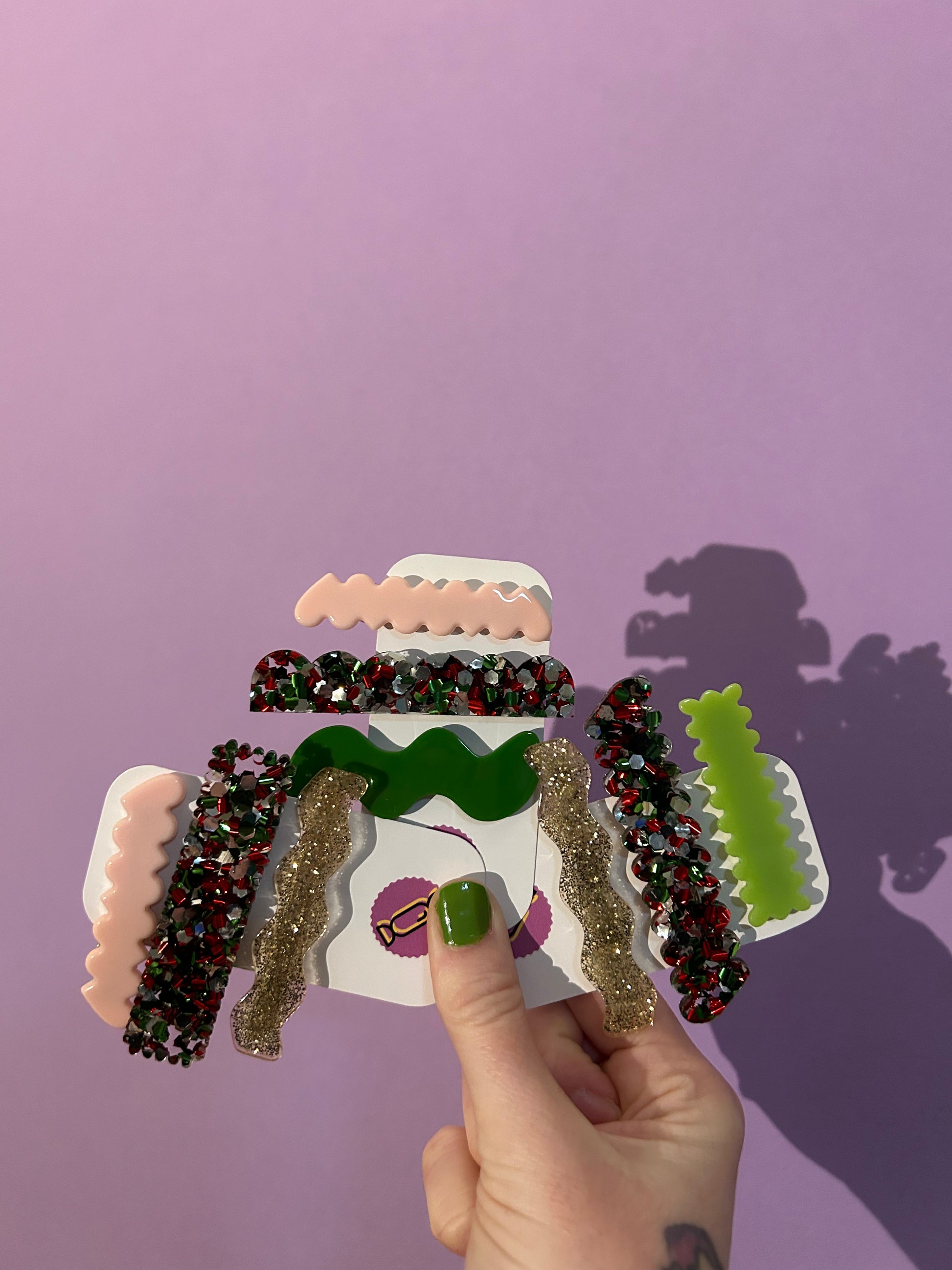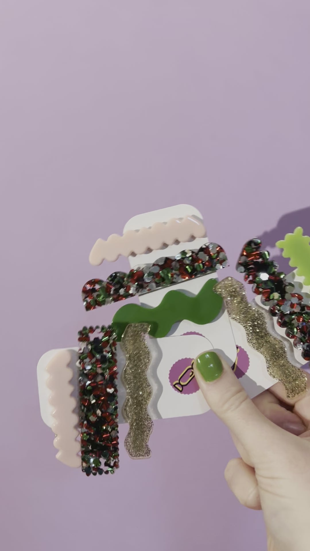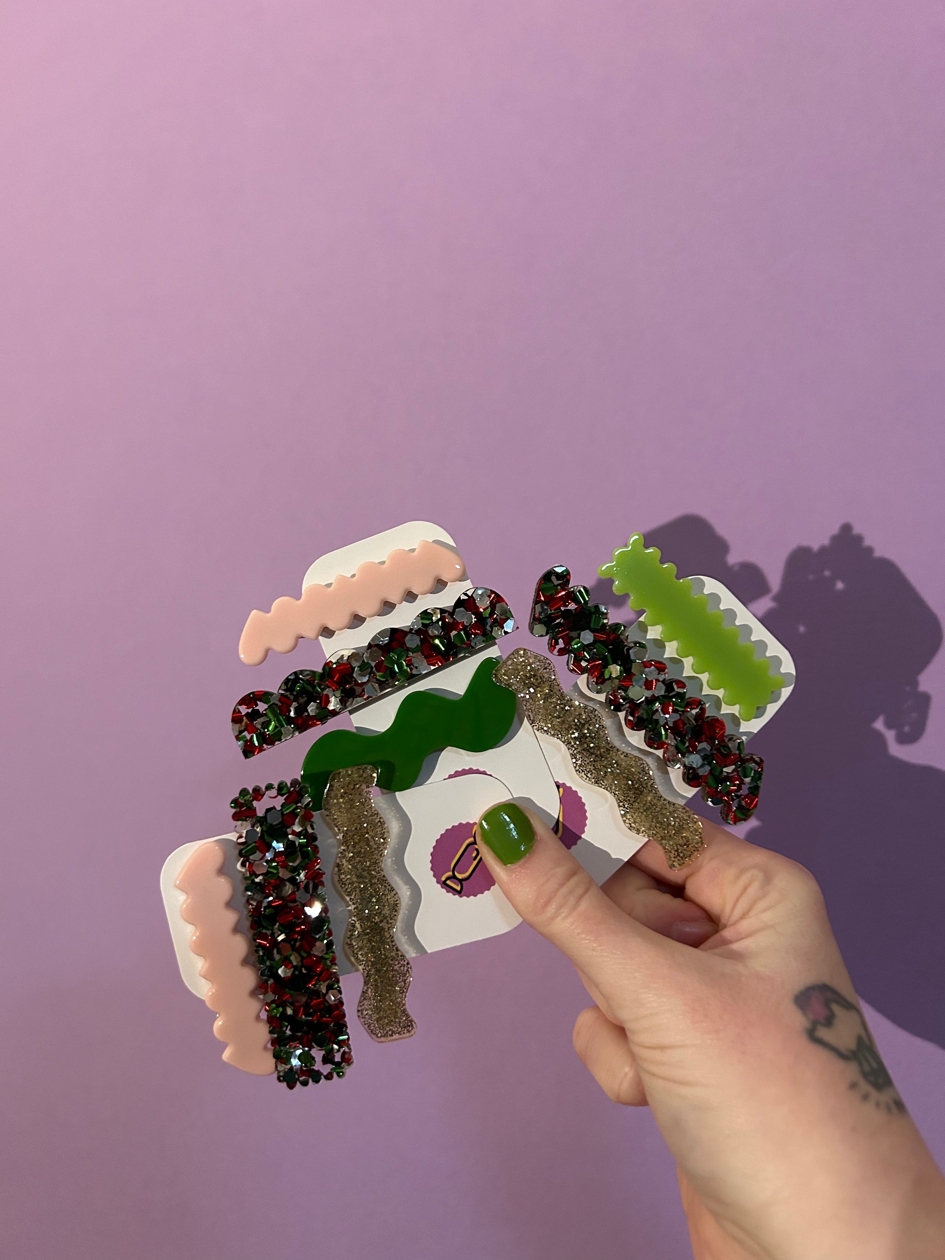 Set 3. Moss green frilly slide, chunky festive glitter slide, gold glitter wavy slide.